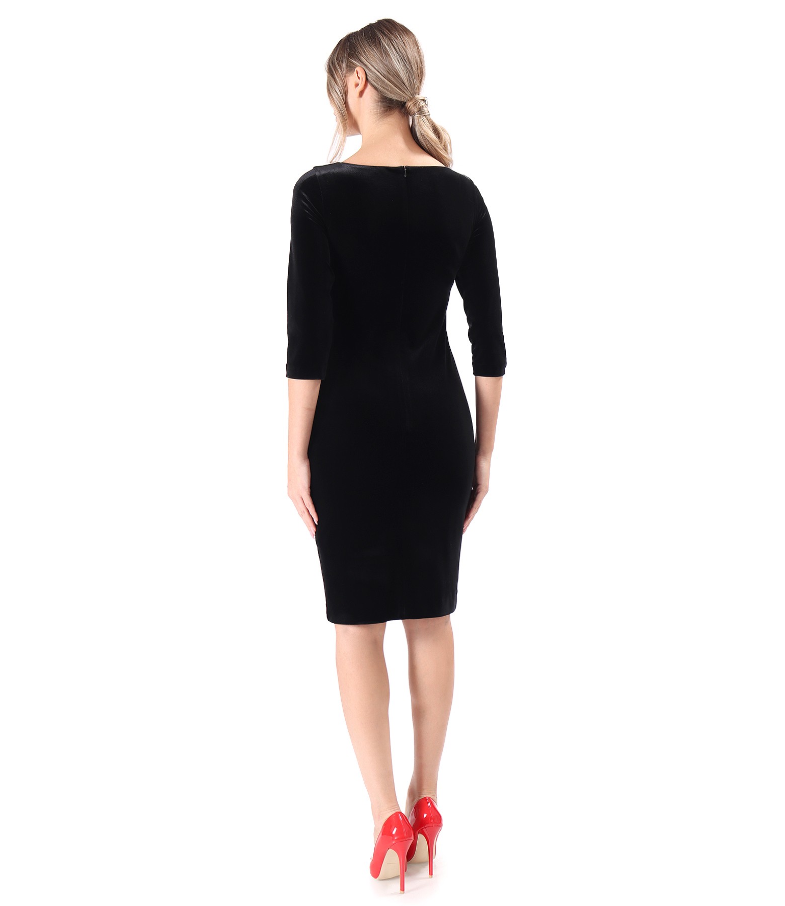 Rochie eleganta din catifea elastica cu brosa detasabila, cu cristale la decolteu, captusita si cu maneci 3/4. Se inchide cu fermoar ascuns pe mijloc spate.