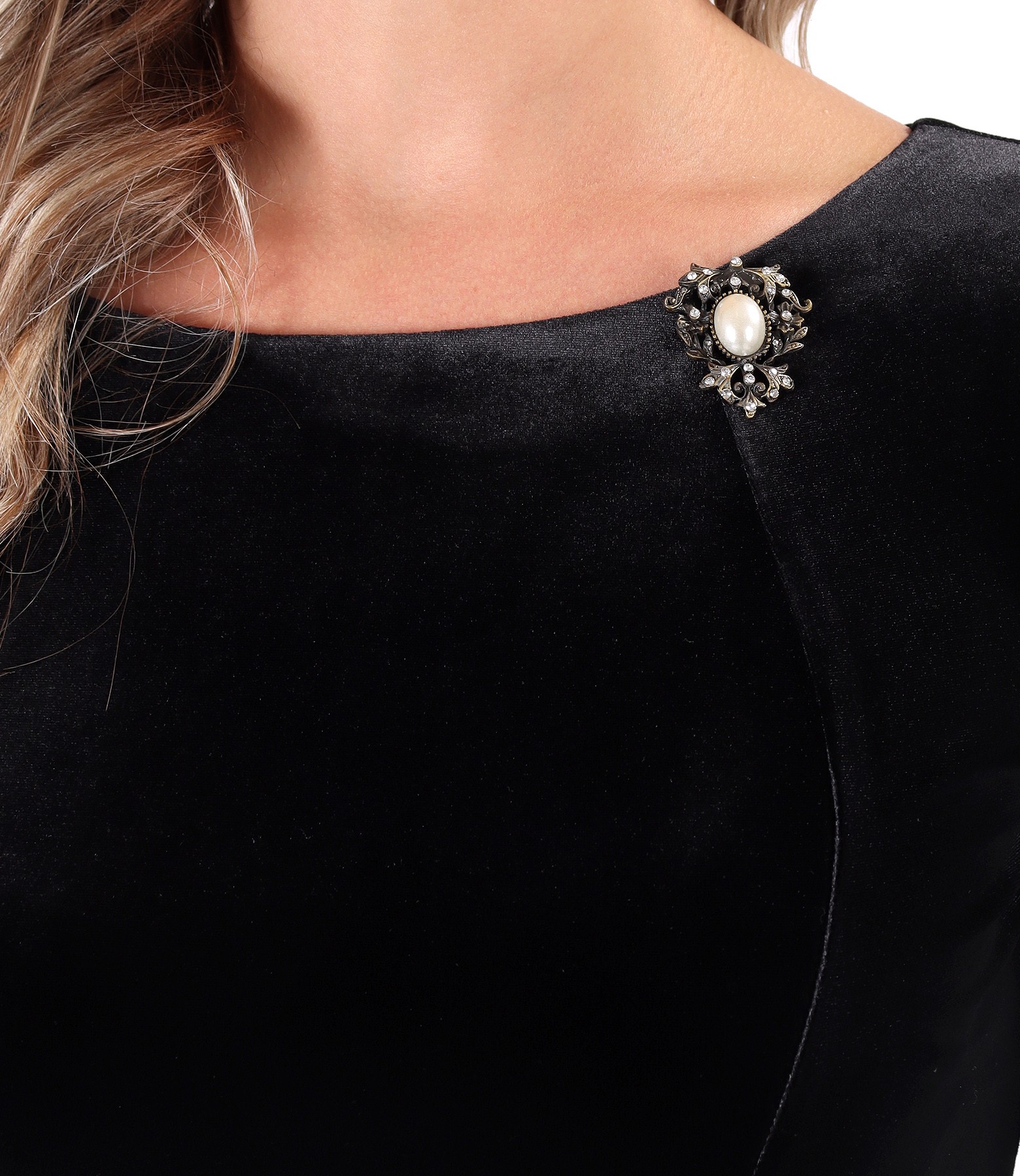 Rochie eleganta din catifea elastica neagra, cu maneci 3/4 si decolteu rotund cu brosa detasabila. Se inchide cu fermoar ascuns pe mijloc spate.