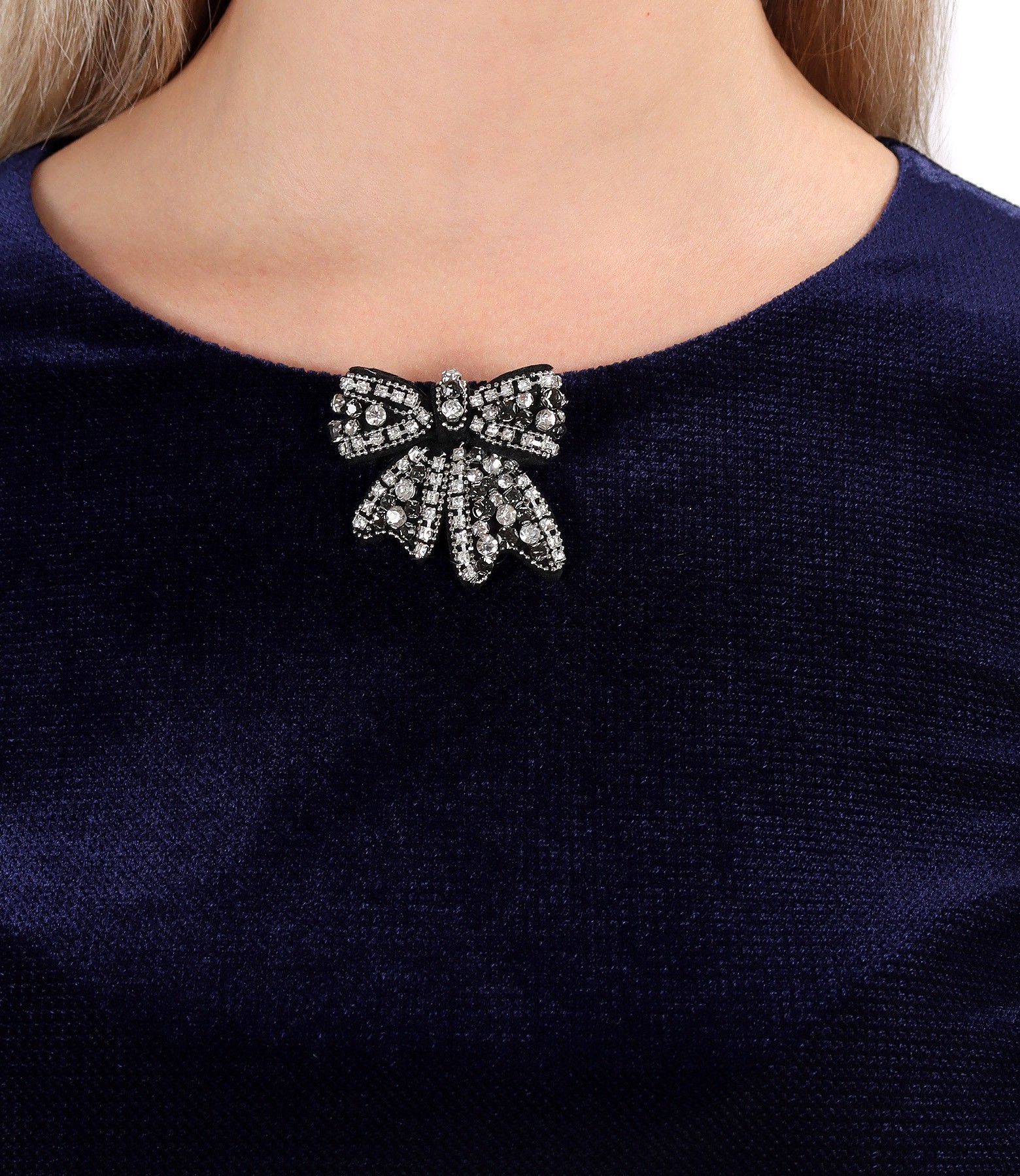 Rochie eleganta, bluzata in talie, din catifea elastica, captusita, cu maneci lungi si decolteu rotund cu brosa detasabila. Se inchide cu fermoar ascuns pe mijloc spate.