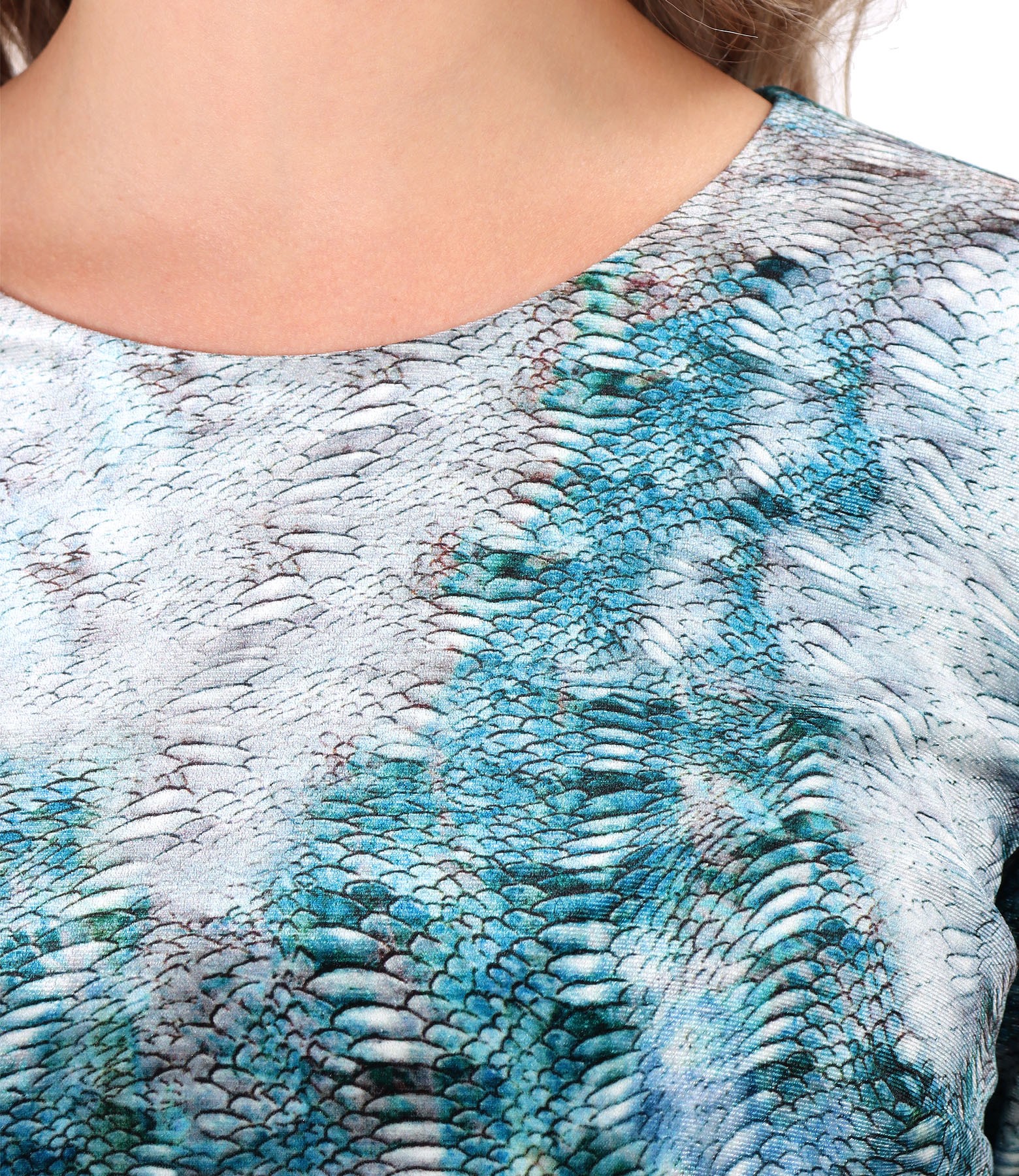 Rochie bluzata in talie, din catifea elastica imprimata, captusita, cu maneci lungi si decolteu rotund. Se inchide cu fermoar ascuns pe mijloc spate.