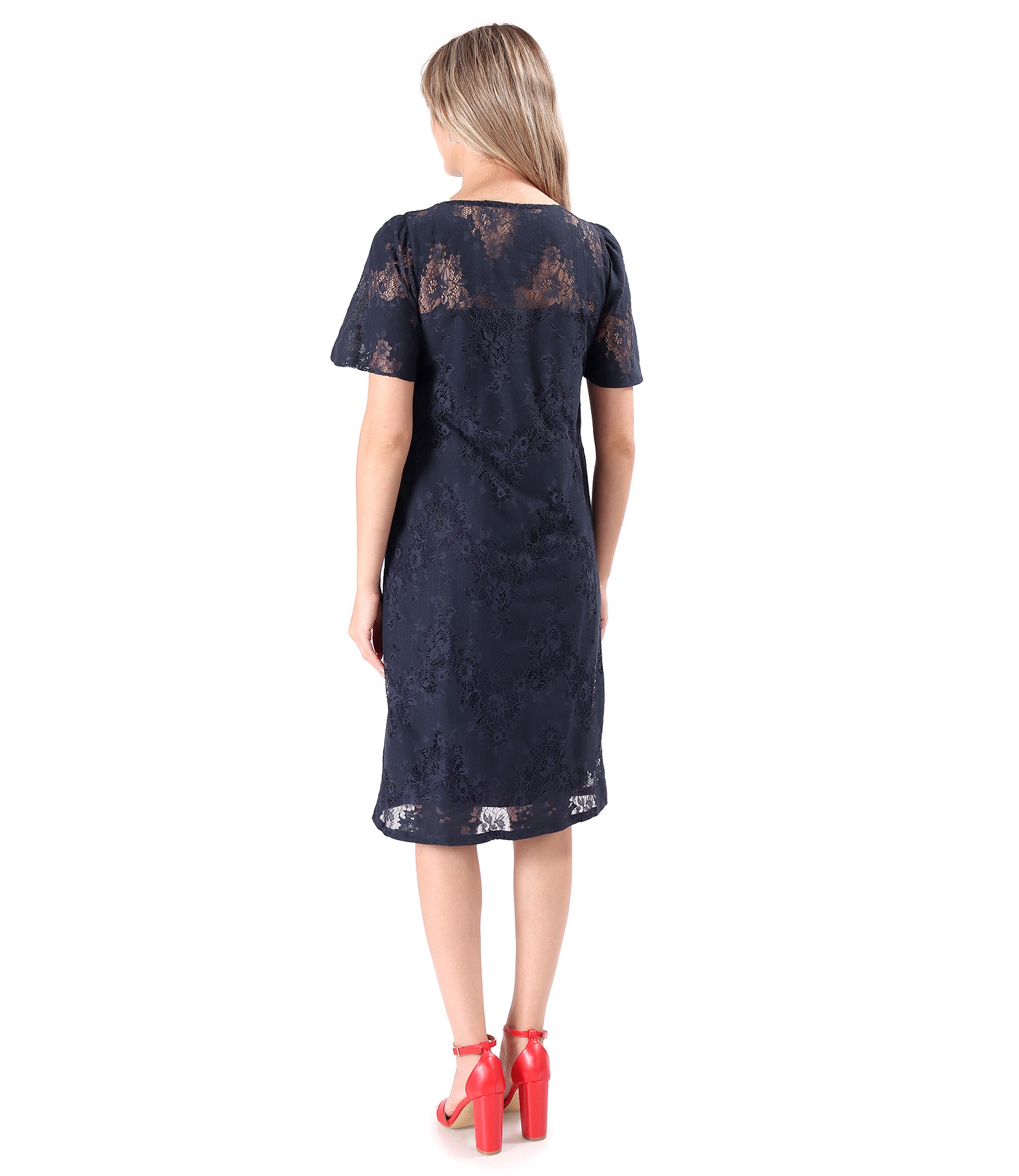 Rochie eleganta din dantela cu bumbac cu motive florale, dublata cu viscoza, cu maneci scurte ample si cu decolteu rotund.
