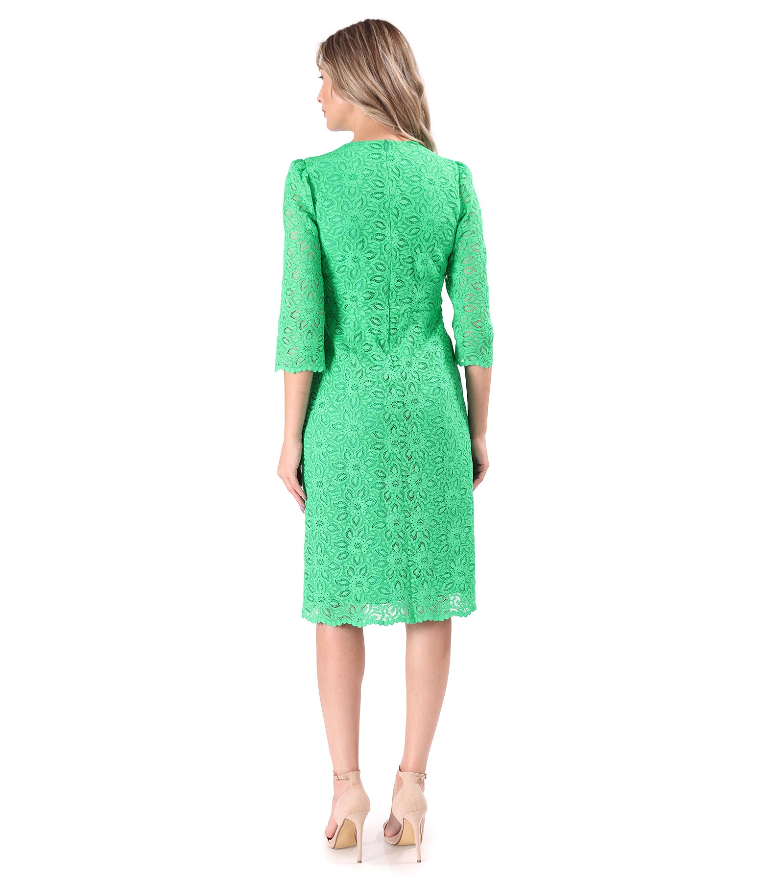 Rochie eleganta din dantela plina de bumbac cu motive florale, dublata cu viscoza, cu maneci 3/4 si cu decolteu rotund. Se inchide cu fermoar ascuns pe mijloc spate.