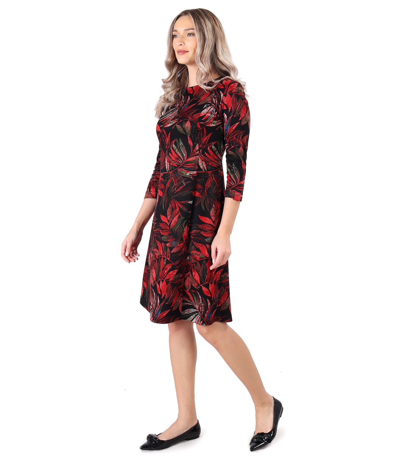 Rochie evazata din jerse elastic gros imprimat cu motive florale, cu maneci 3/4 si decolteu rotnd. Se inchide cu fermoar ascuns pe mijloc spate.