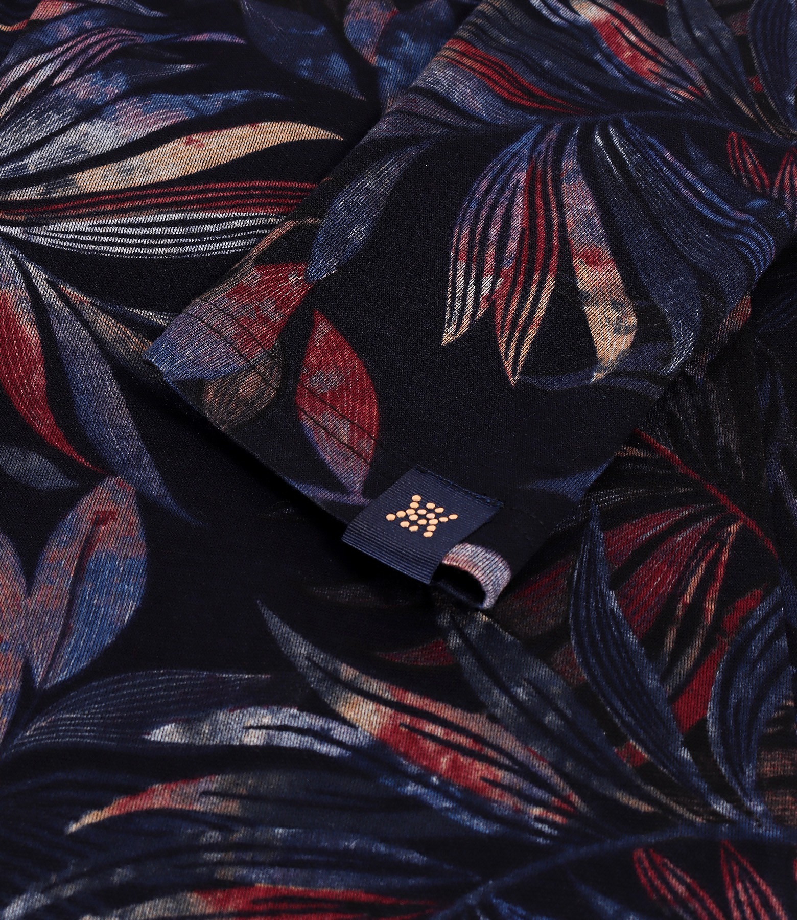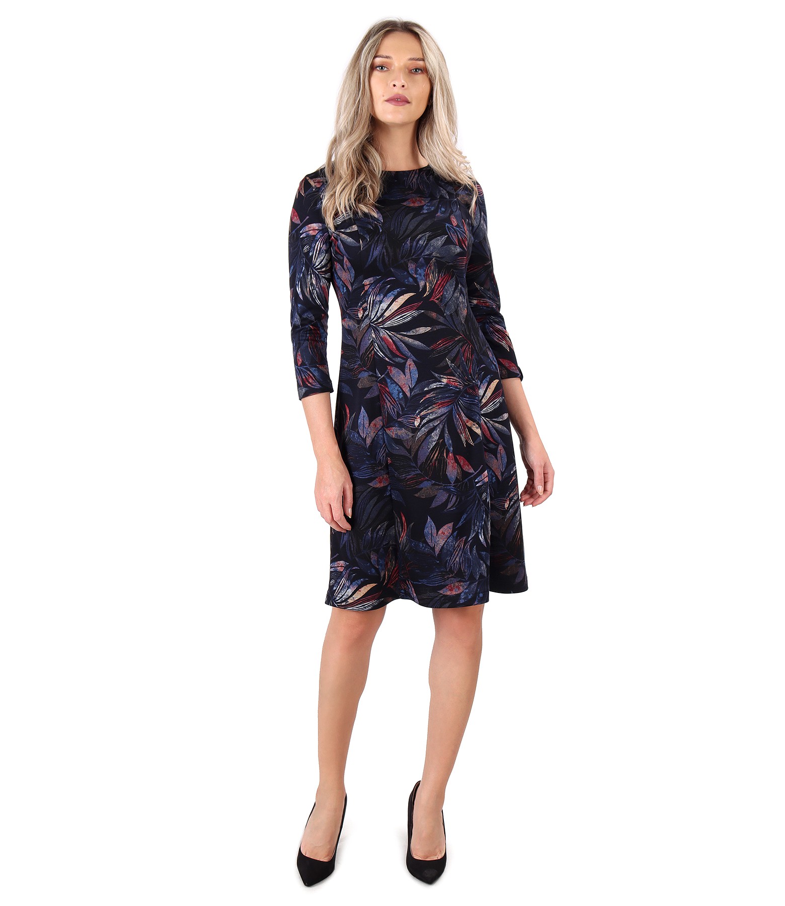 Rochie evazata din jerse elastic gros imprimat cu motive florale, cu maneci 3/4 si decolteu rotnd. Se inchide cu fermoar ascuns pe mijloc spate.