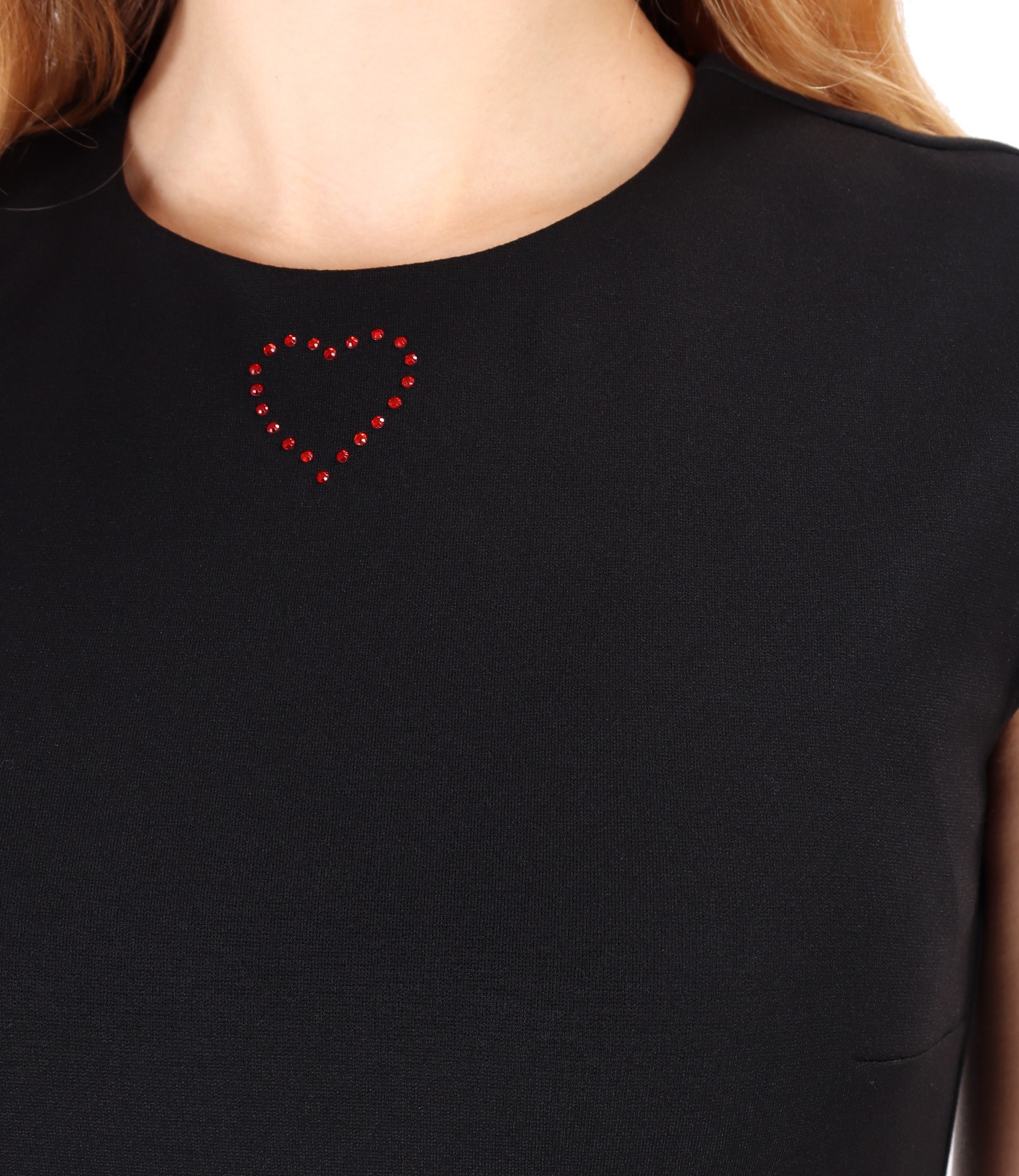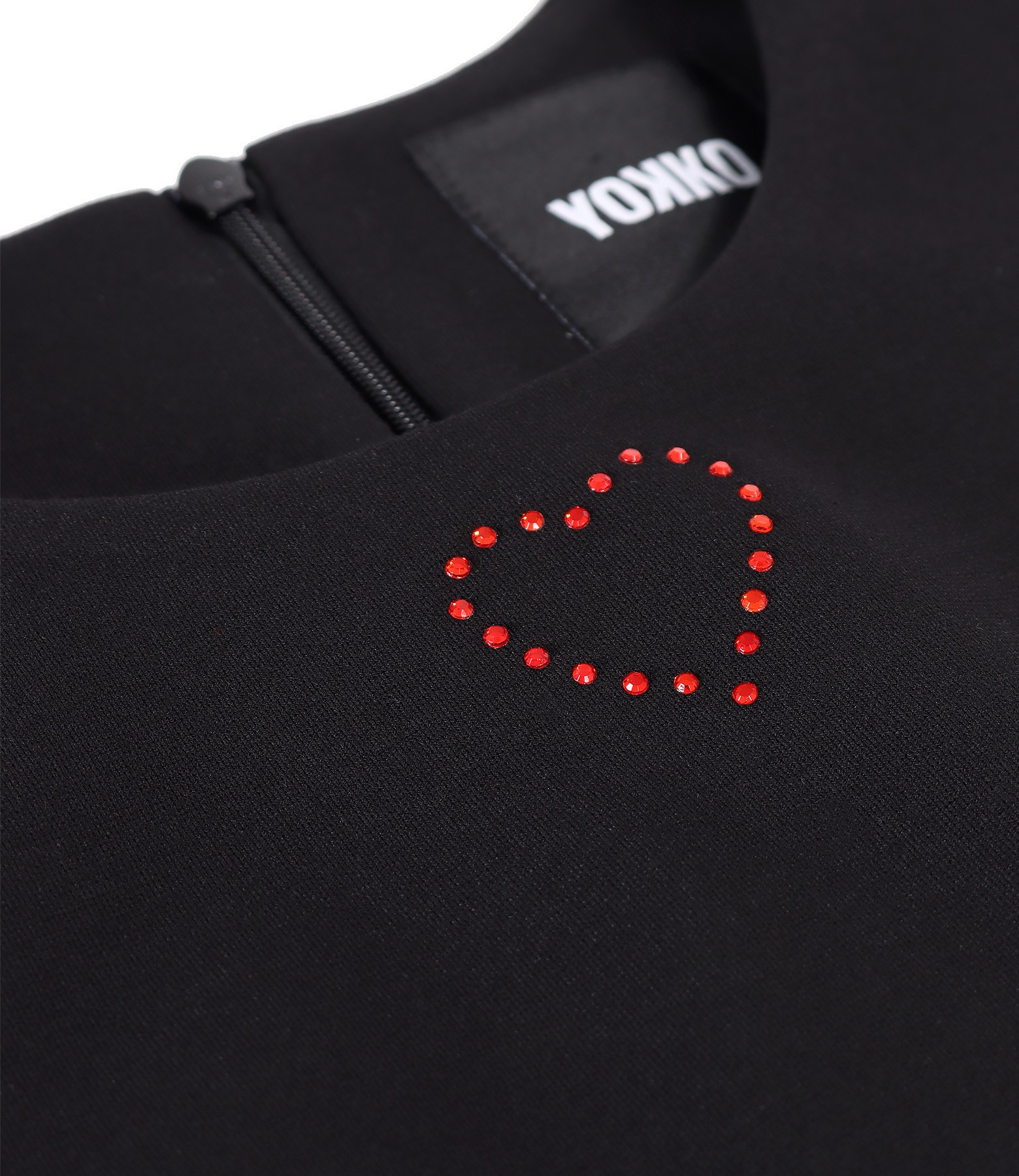 Rochie eleganta din jerse elastic gros, necaptusita, cu maneci scurte tip chimono, decolteu rotund cu inima rosie. Se inchide cu fermoar ascuns pe mijloc spate.