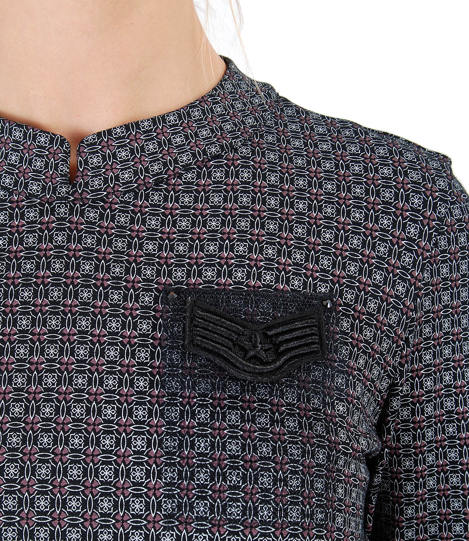 Rochie eleganta din jerse elastic gros imprimat cu motive geometrice, necaptusita, cu guler tunica, maneci lungi si buzunar din tul cu aplicatie de cristale. Se inchide cu fermoar ascuns pe mijloc spate.