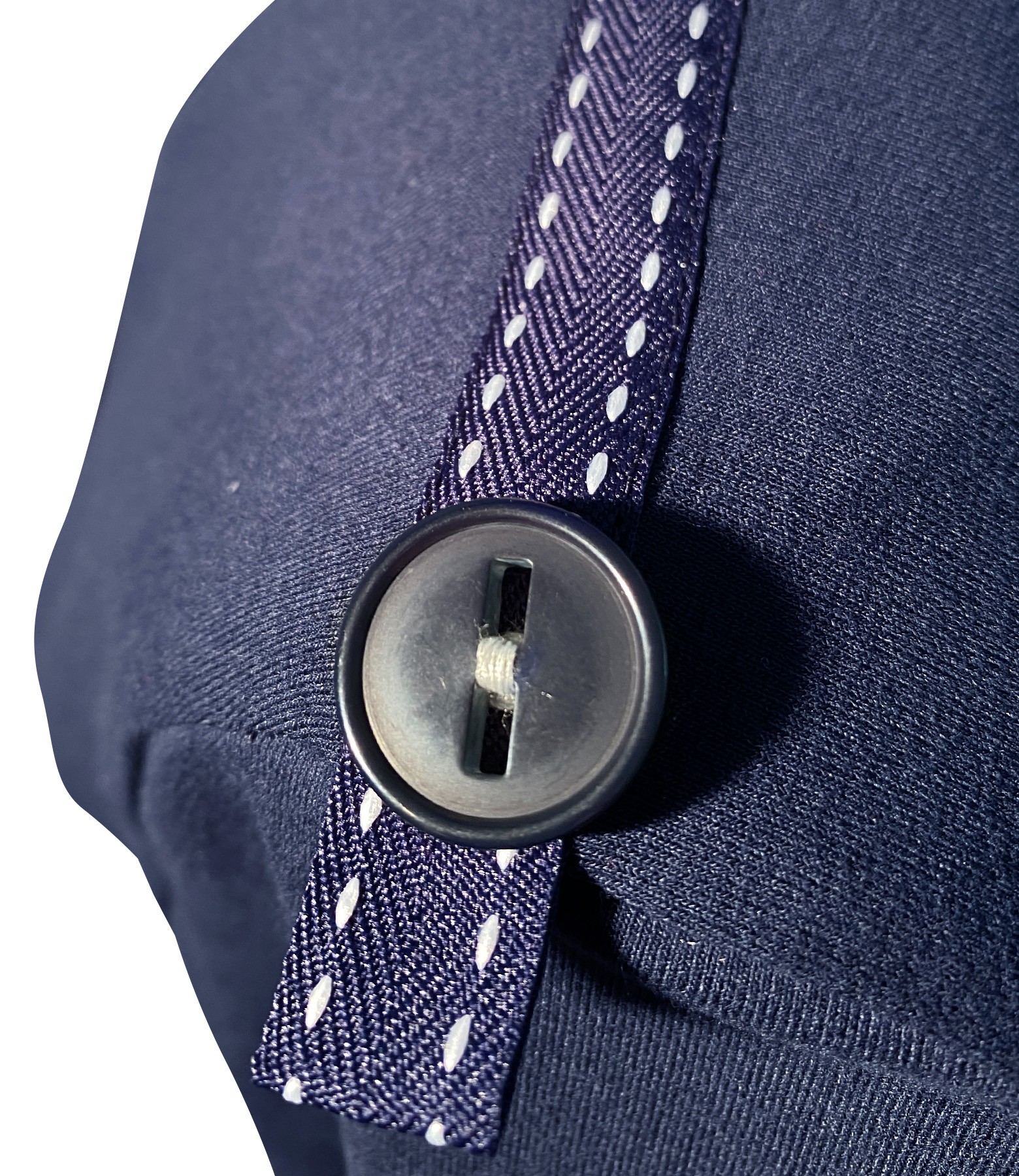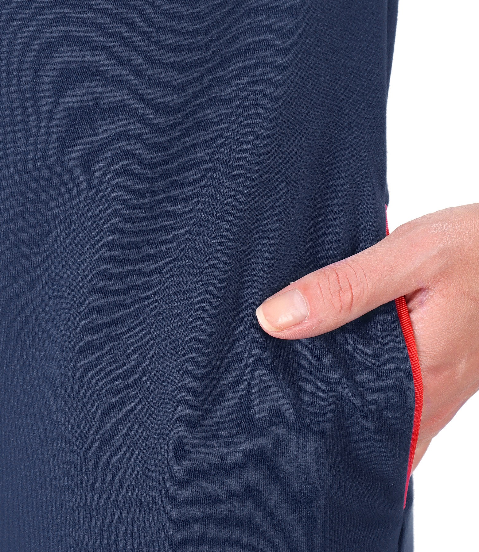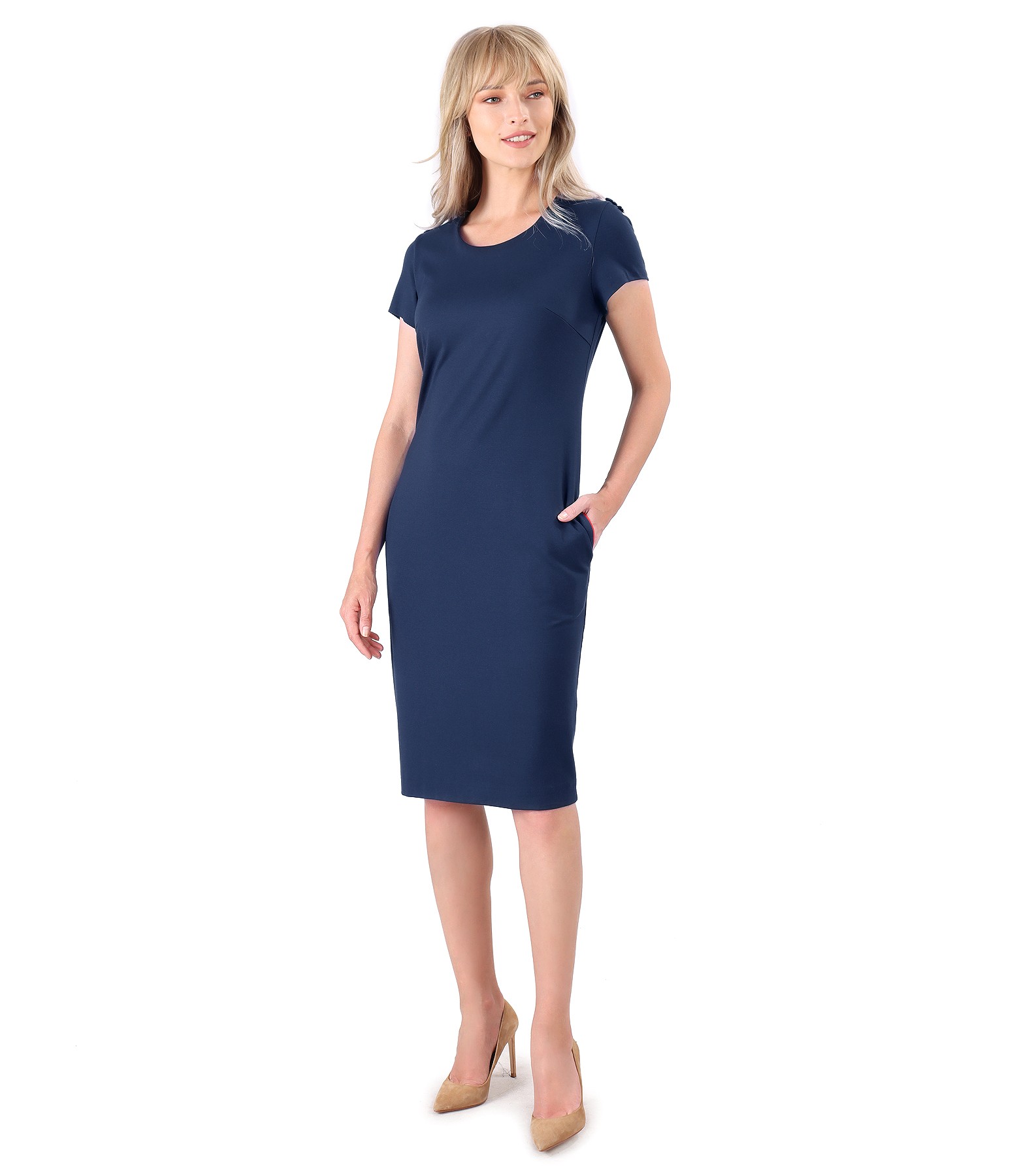 Rochie necaptusita din jerse elastic de viscoza, cu decolteu rotund, buzunare laterale si epoleti cu banda ripsata cu nasturi aplicata pe umeri. Nu are sistem de inchidere.