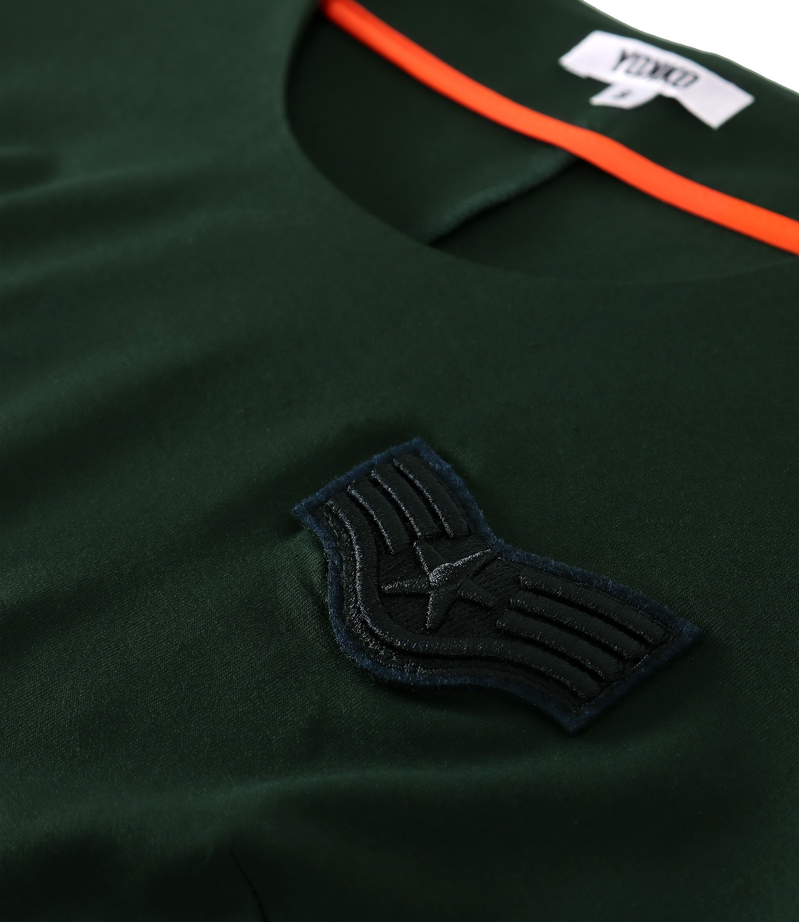 Rochie necaptusita din jerse elastic de viscoza, cu decolteu rotund, buzunare laterale si epoleti cu banda ripsata cu nasturi aplicata pe umeri. Nu are sistem de inchidere.