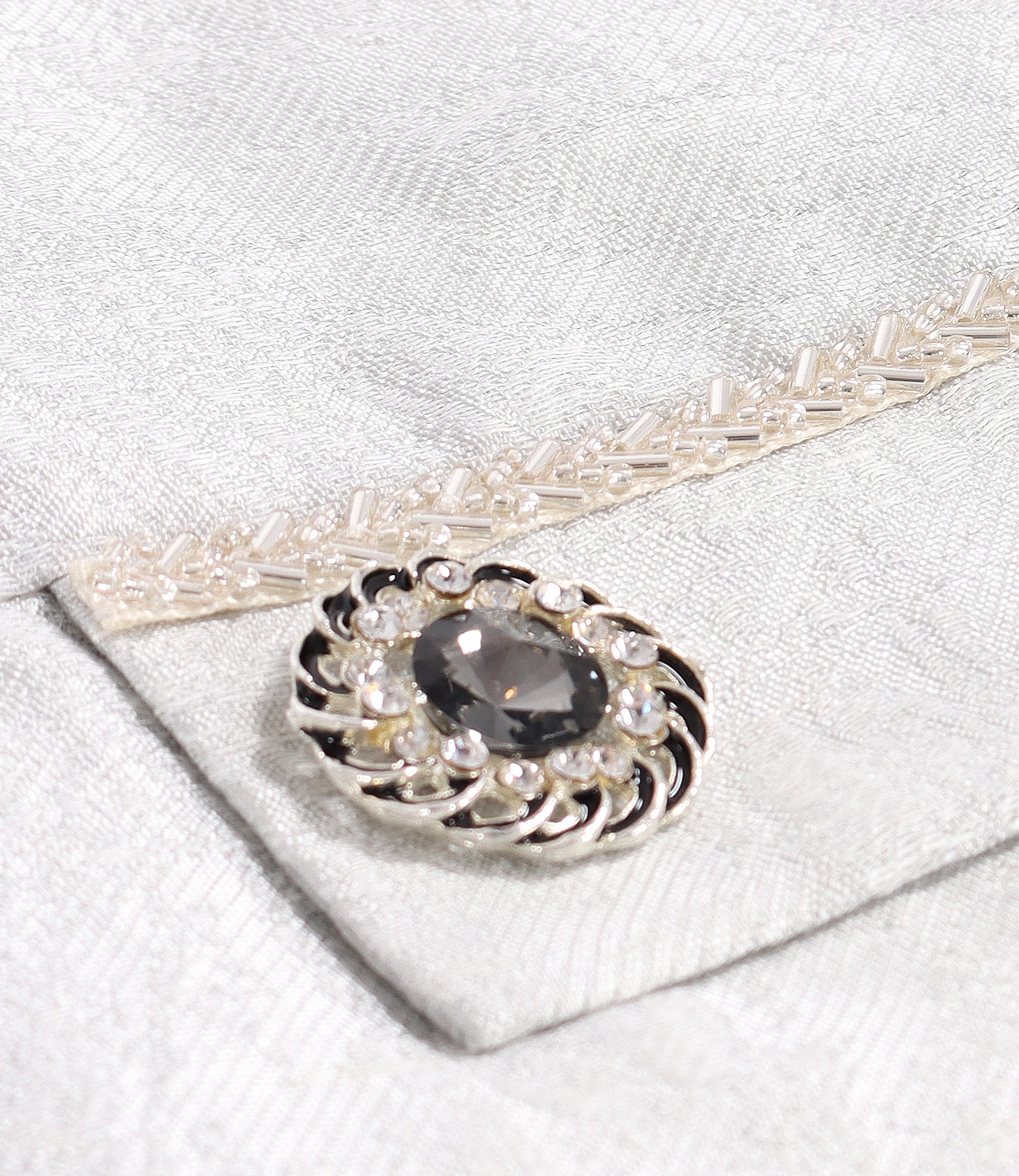 Rochie eleganta din stofa brocata cu in, cu fusta dublata cu viscoza, cu maneci scurte si clape cu nasture si pasmanterie decorativa in dreptul taliei. Se inchide cu fermoar ascuns pe mijloc spate.
