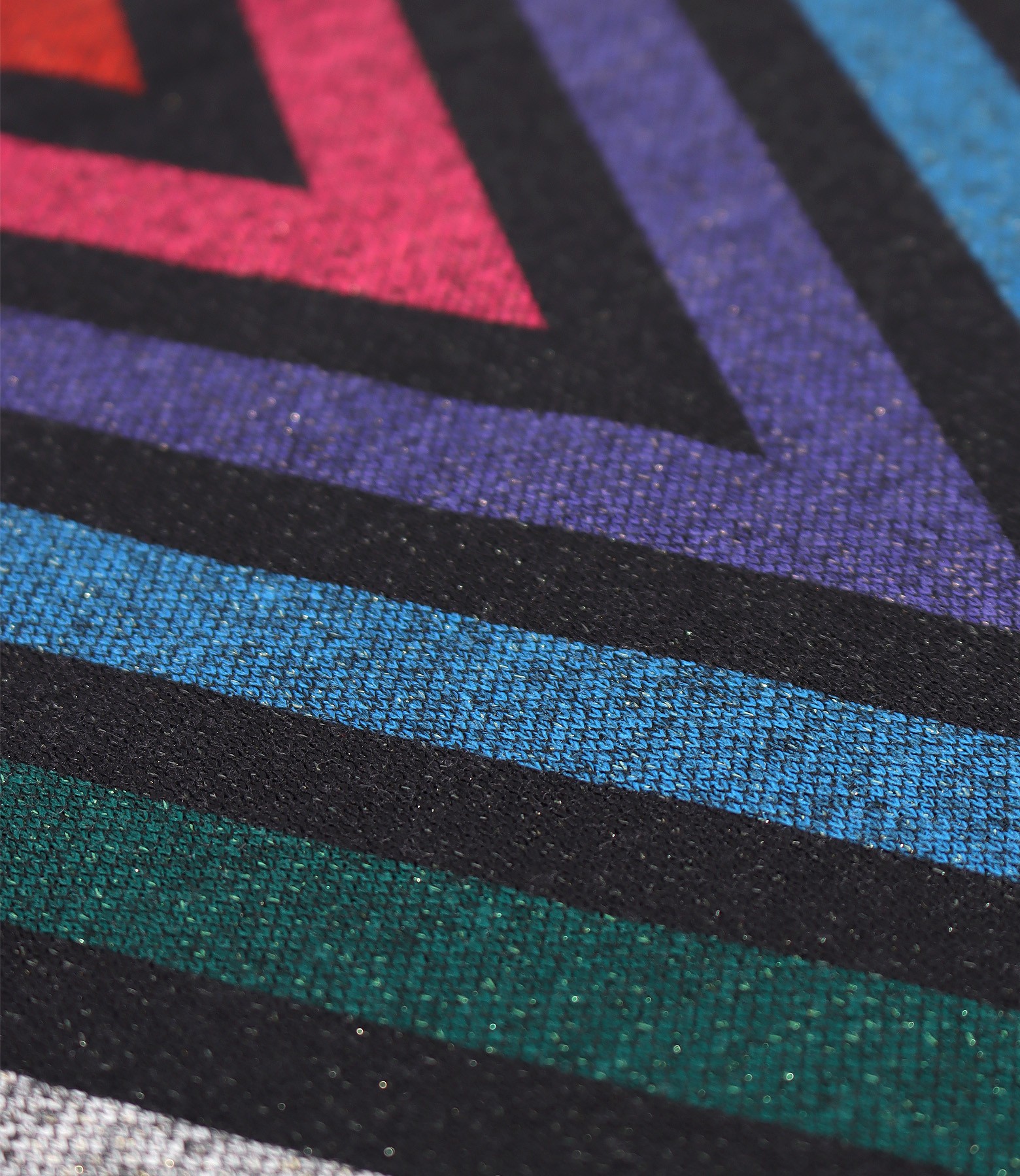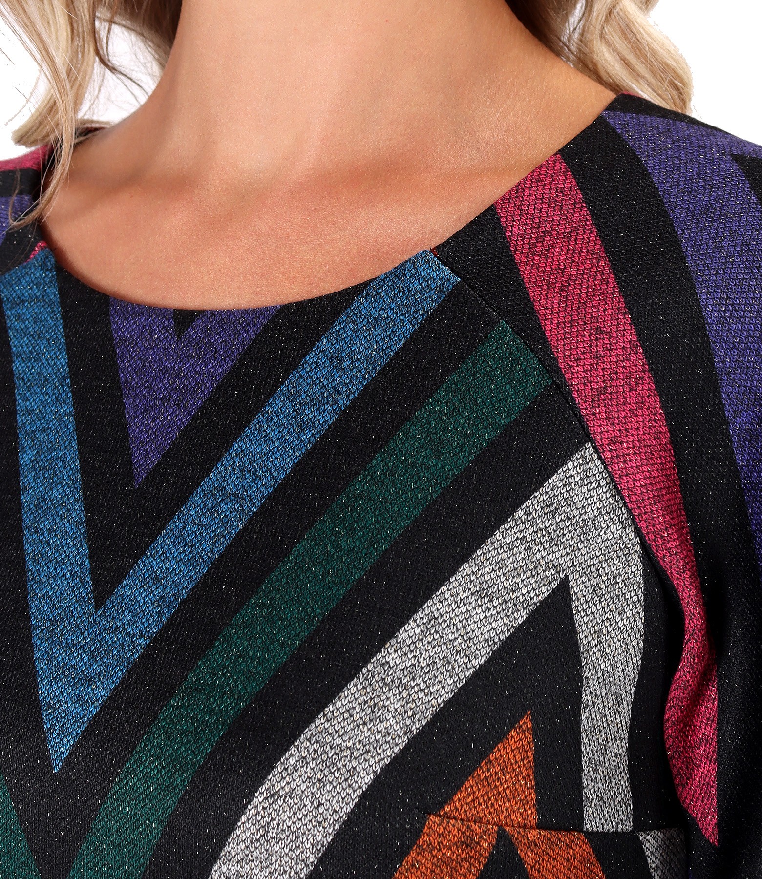 Rochie eleganta din stofa elastica cu fir de lurex, imprimata cu motive geometrice, cu decolteu rotund si maneci raglan 3/4 usor evazate. Se inchide cu fermoar ascuns pe mijloc spate.