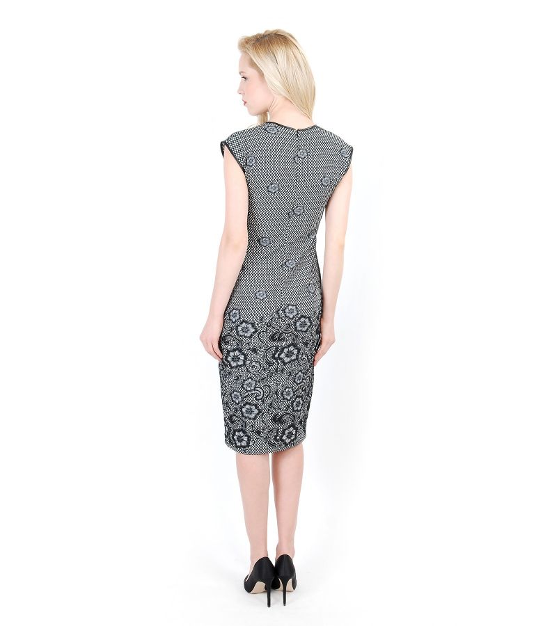 Rochie necaptusita din stofa elastica cu motive florale si geometrice in relief, cu decolteu rotund si umeri cazuti. Se inchide cu fermoar ascuns pe mijloc spate.