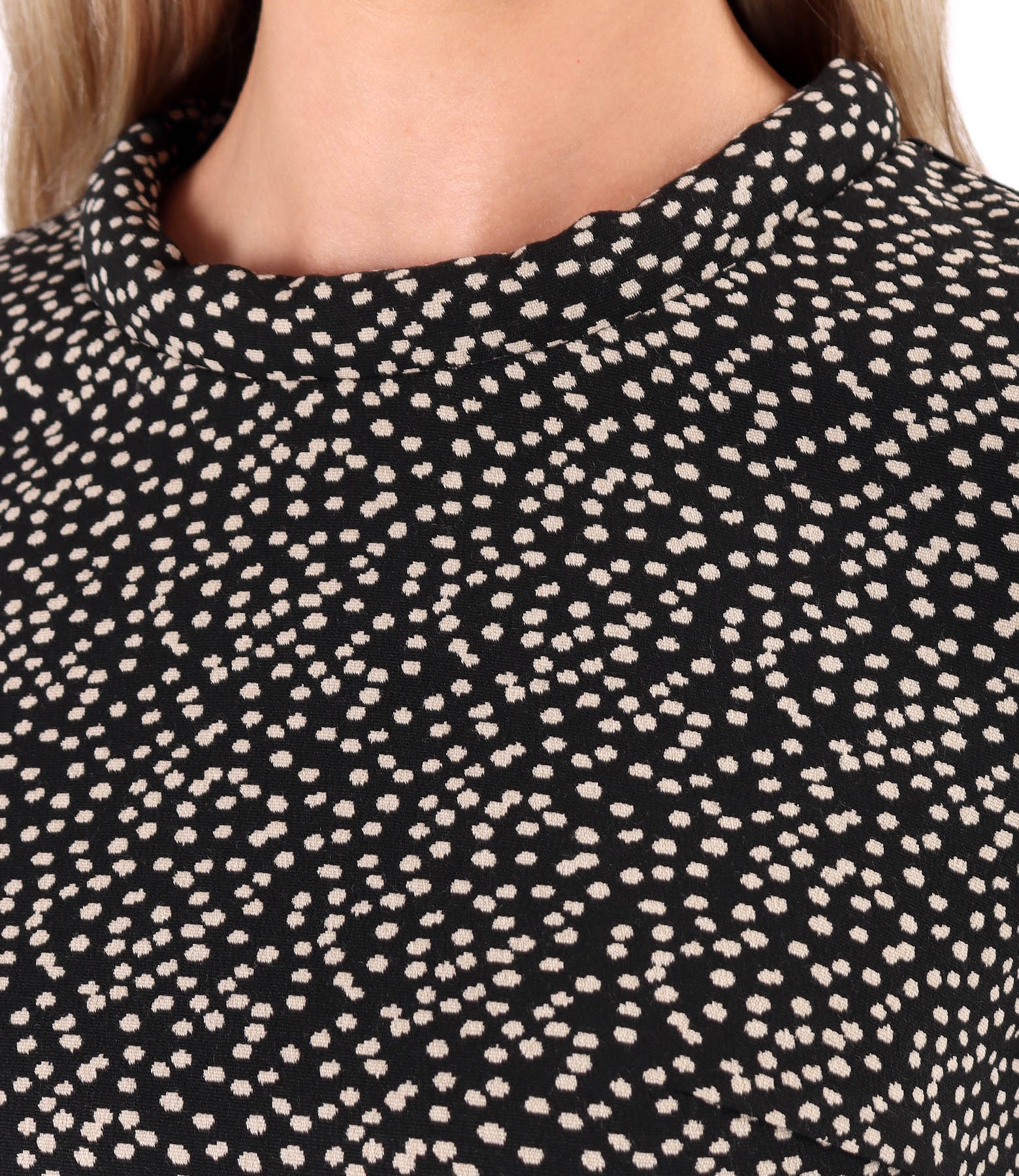 Rochie eleganta din stofa elastica groasa brocata, necaptusita, cu maneci 3/4 cu bordura contrast, buzunare laterale cu decor inima si guler tubular. Se inchide cu fermoar ascuns pe mijloc spate.