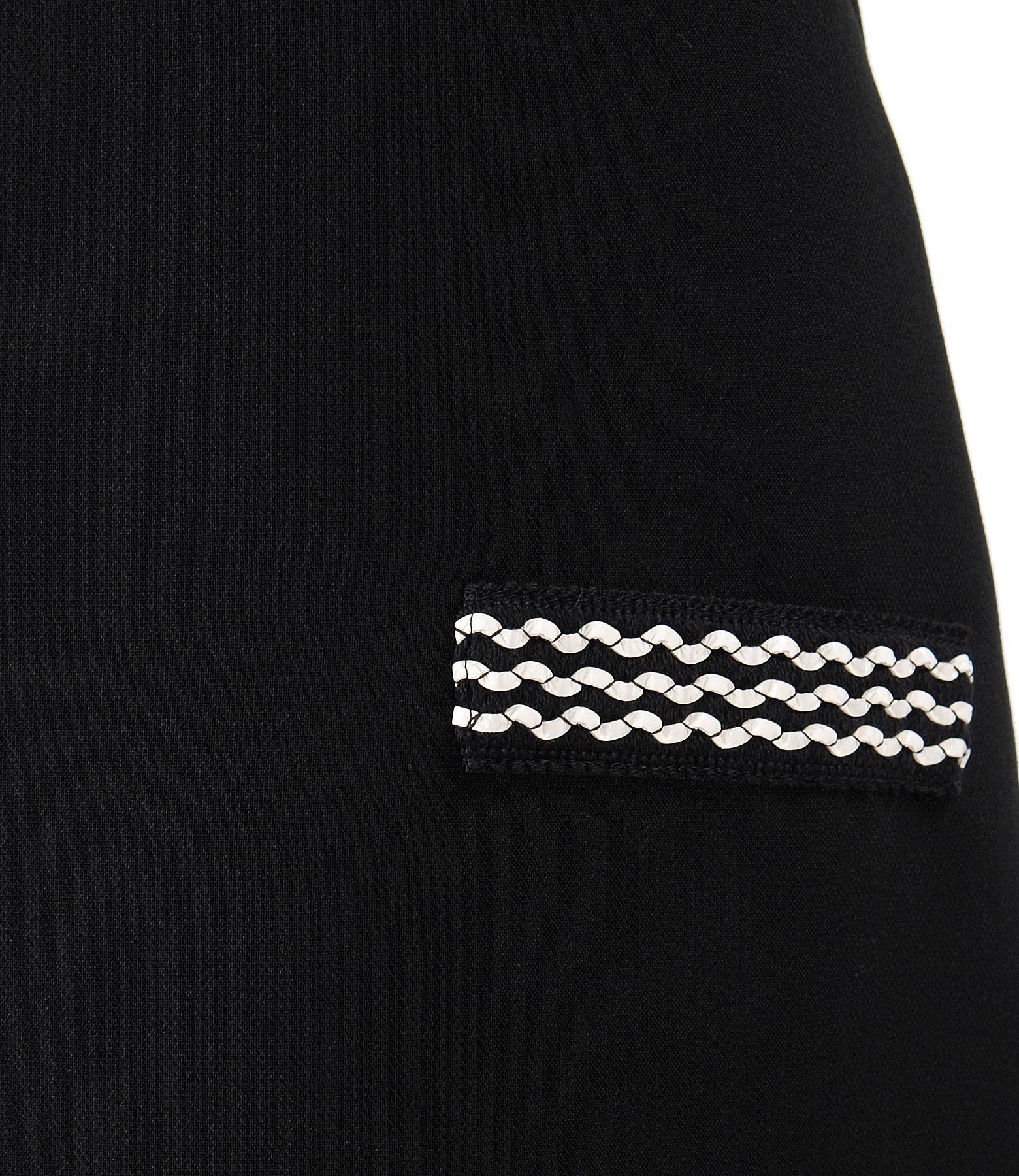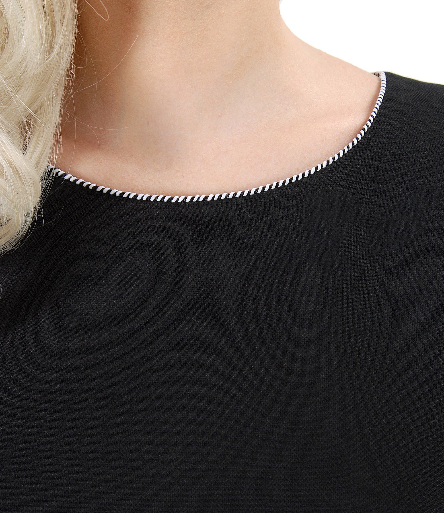 Rochie eleganta din stofa elastica neagra groasa, captusita, in forma de A, accesorizata in contrast cu clape false si passepoil decolteu. Se inchide cu fermoar ascuns pe mijloc spate.