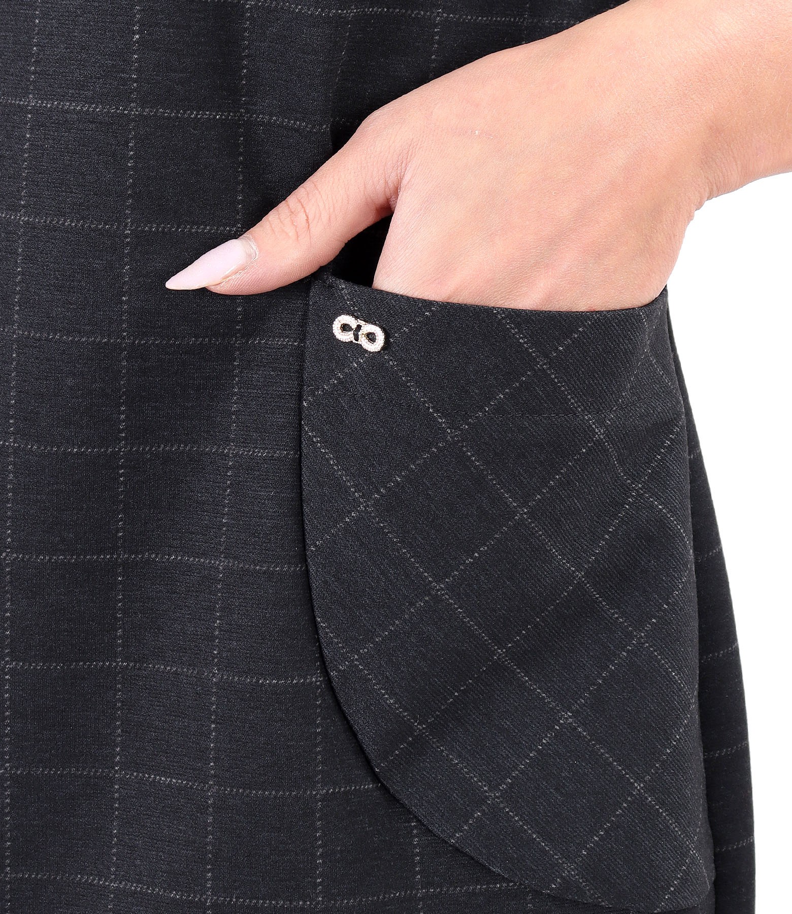Rochie eleganta din stofa groasa in carouri, necaptusita, maneci 3/4, guler stei si buzunare aplicate pe fata fata. Se inchide cu fermoar ascuns pe mijloc spate.