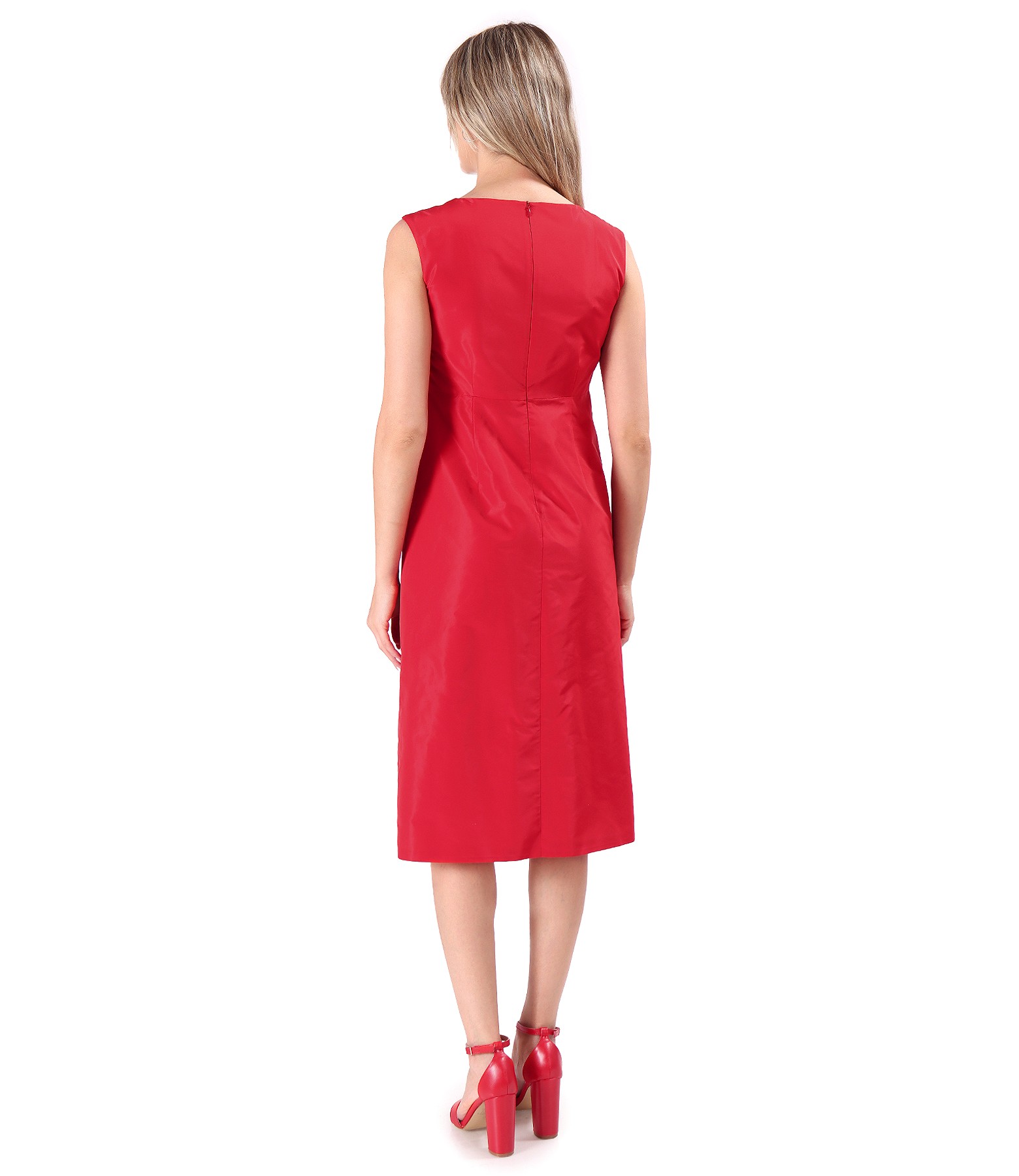 Rochie eleganta din tafta usoara, cu efect mat, cu brosa detasabila in talie, in forma de floare, dublata cu viscoza, fara maneci si cu decolteu rotund. Se inchide cu fermoar ascuns pe mijloc spate.