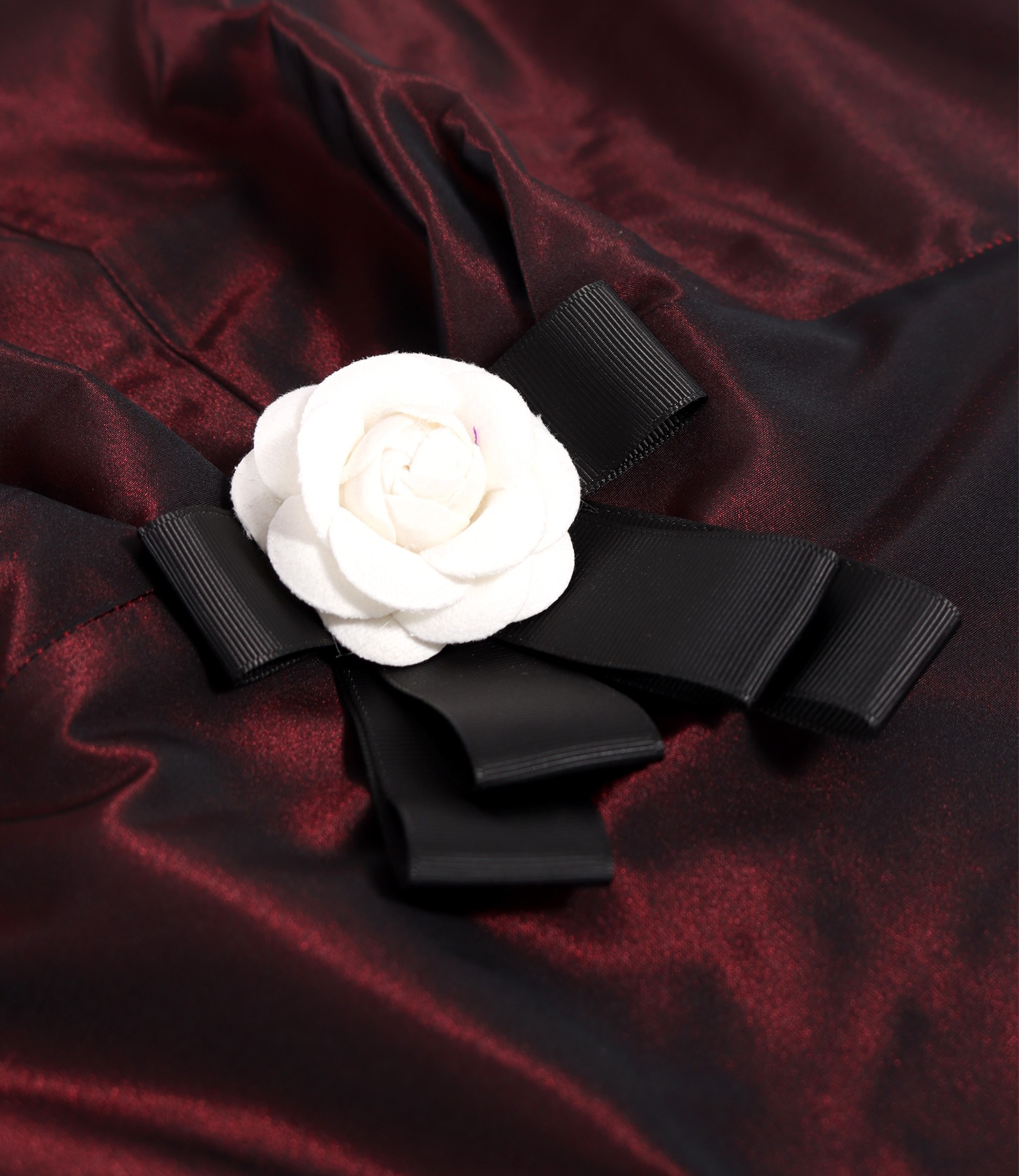 Rochie eleganta din tafta usoara, cu efect mat, cu brosa detasabila in talie, in forma de floare, dublata cu viscoza, fara maneci si cu decolteu rotund. Se inchide cu fermoar ascuns pe mijloc spate.