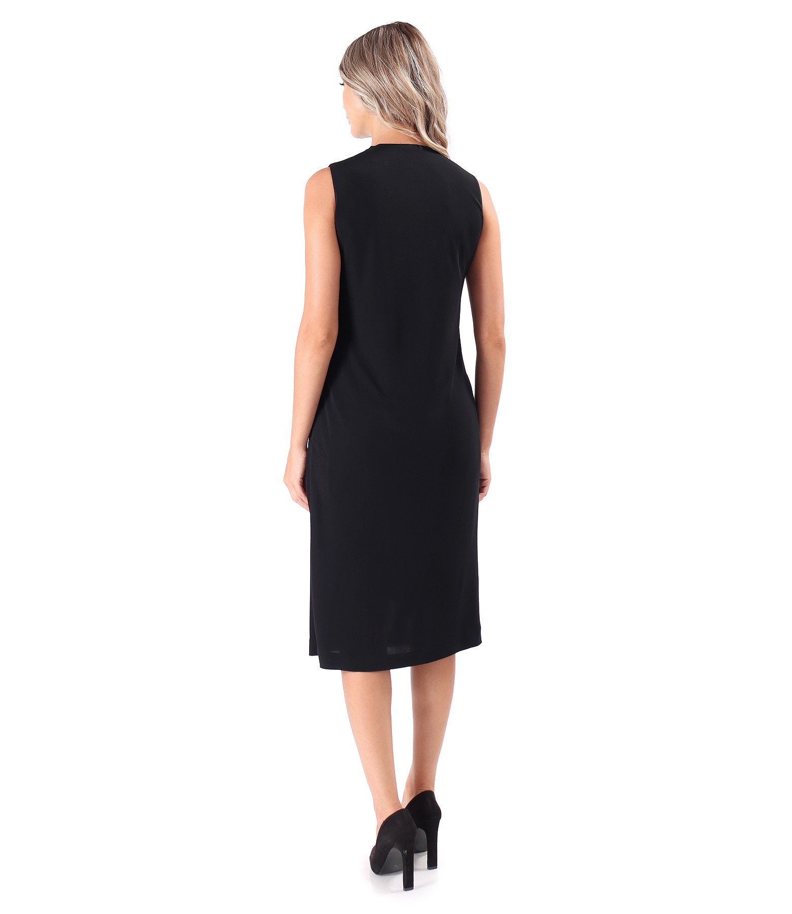 Rochie eleganta din viscoza cu fermoare pe umeri, cu decolteu rotund si buzunare laterale.