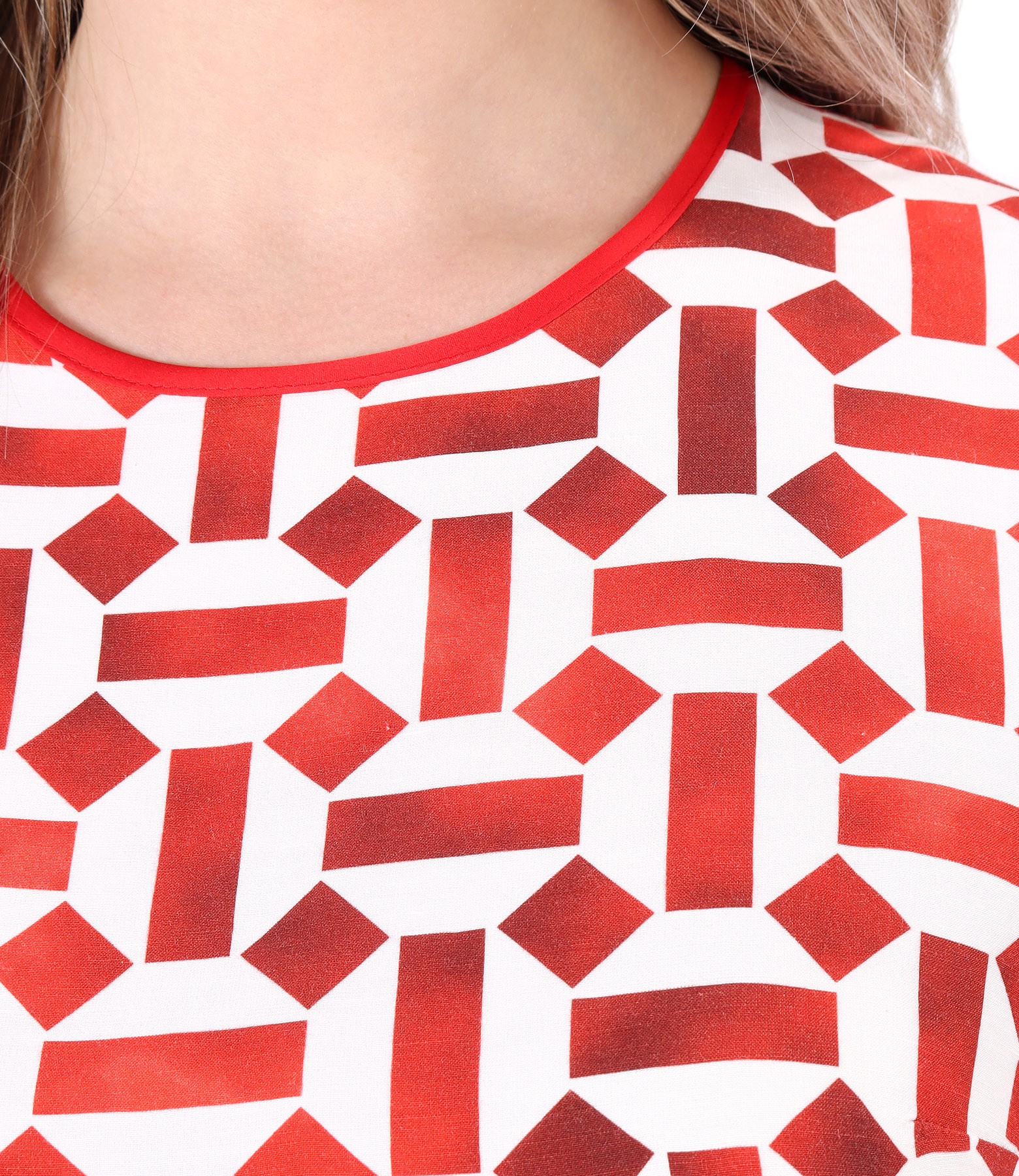 Rochie eleganta din viscoza cu in, imprimata digital cu motive geometrice, necaptusita, cu decolteu rotund si maneci scurte.