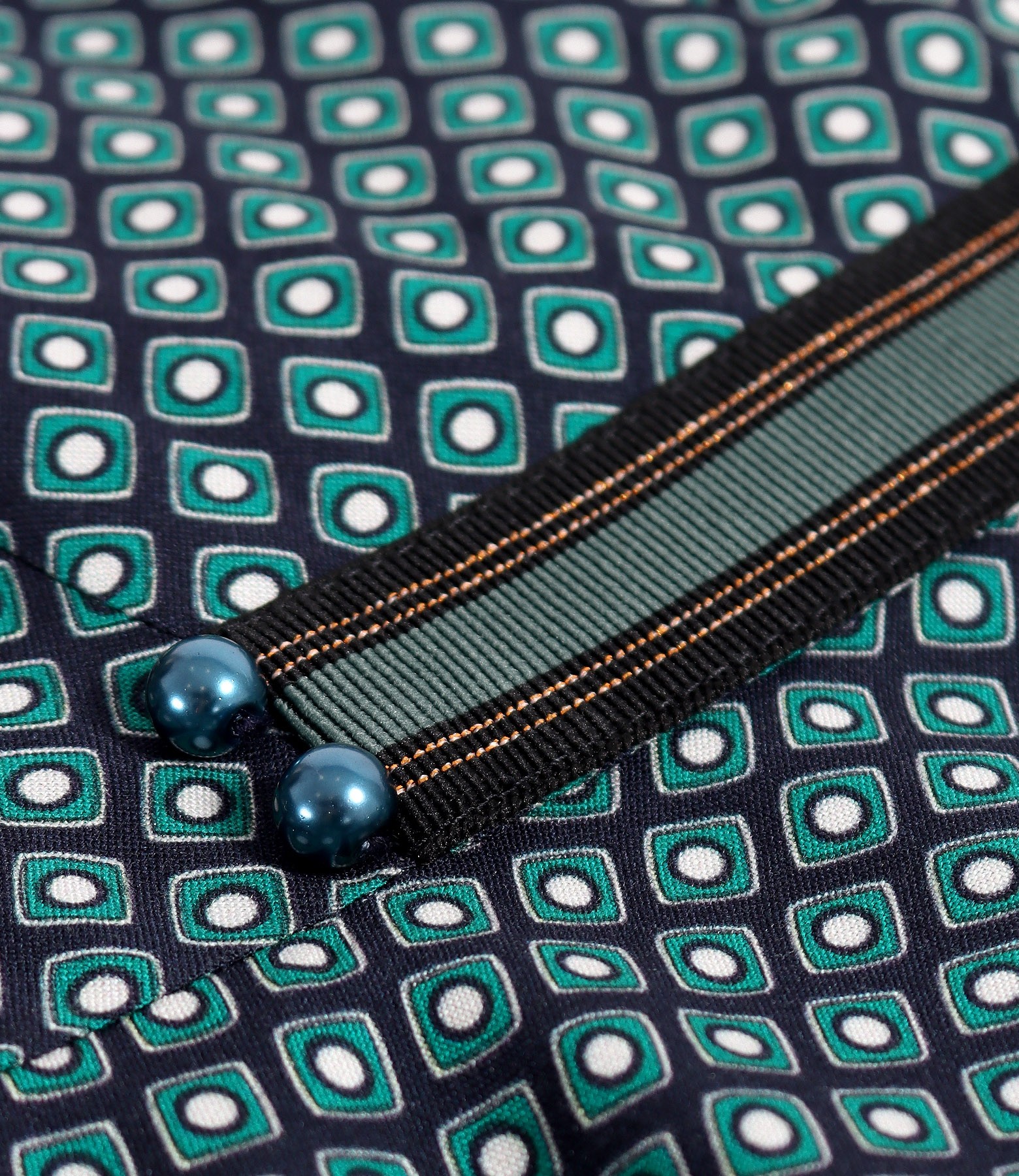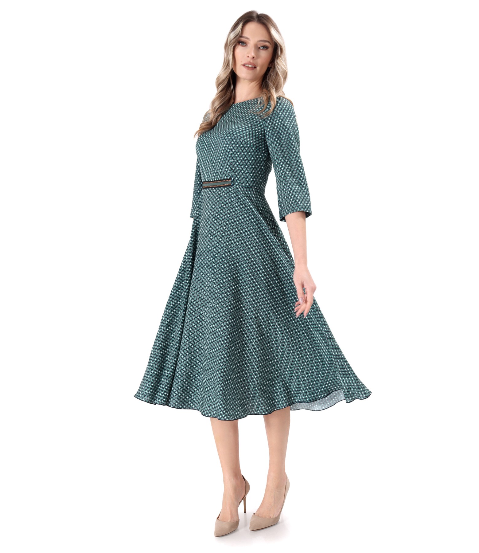 Rochie eleganta din viscoza imprimata cu motive geometrice, dublata cu viscoza in partea de sus, cu maneci 3/4, si cu banda decorativa in talie. Se inchide cu fermoar ascuns pe mijloc spate.