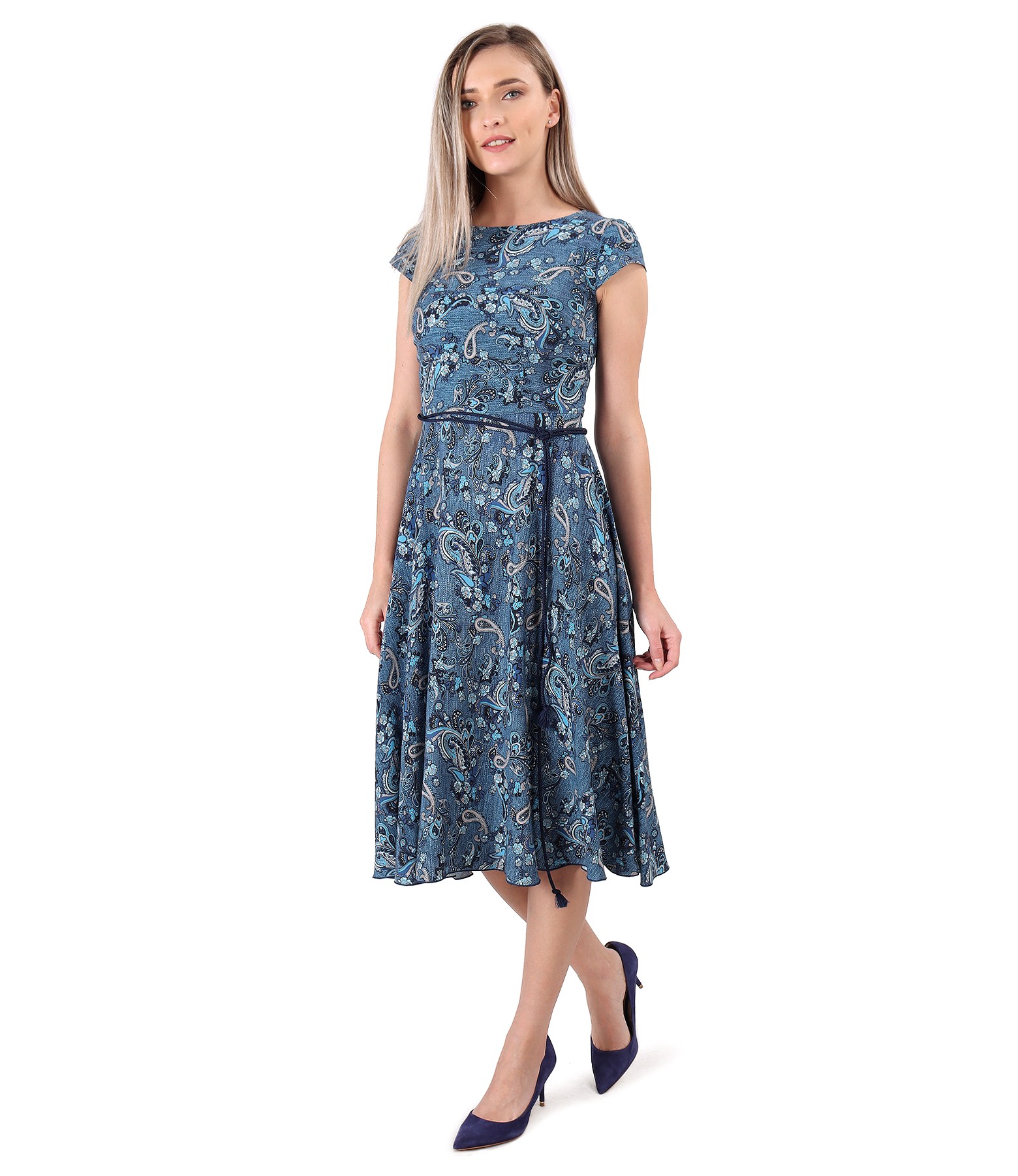Rochie eleganta din viscoza imprimata cu motive paisley, dublata cu viscoza in partea de sus, cu maneci scurte, decolteu rotund si sfoara in talie. Se inchide cu fermoar ascuns pe mijloc spate.