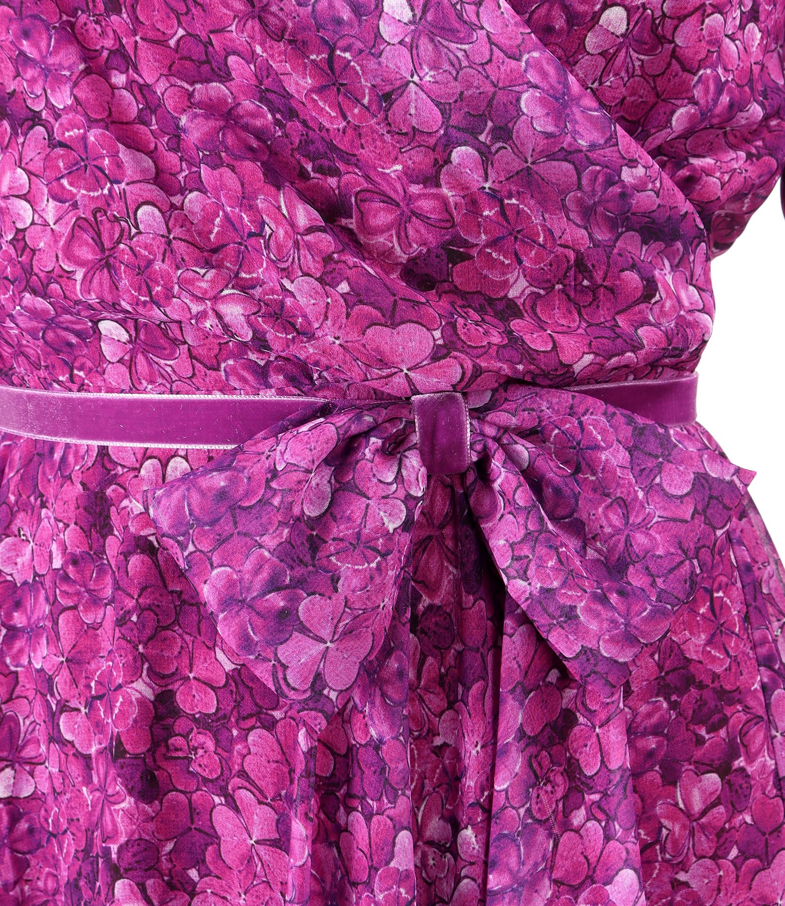 Rochie din voal imprimat digital cu motive florale, dublata cu viscoza, cu maneci 3/4 si pieptii petrecuti. Se inchide cu fermoar ascuns pe mijloc spate. Se strange cu un cordon din catifea cu funda din voal in talie. La marimile mari XL-3XL, spatele este dublat.