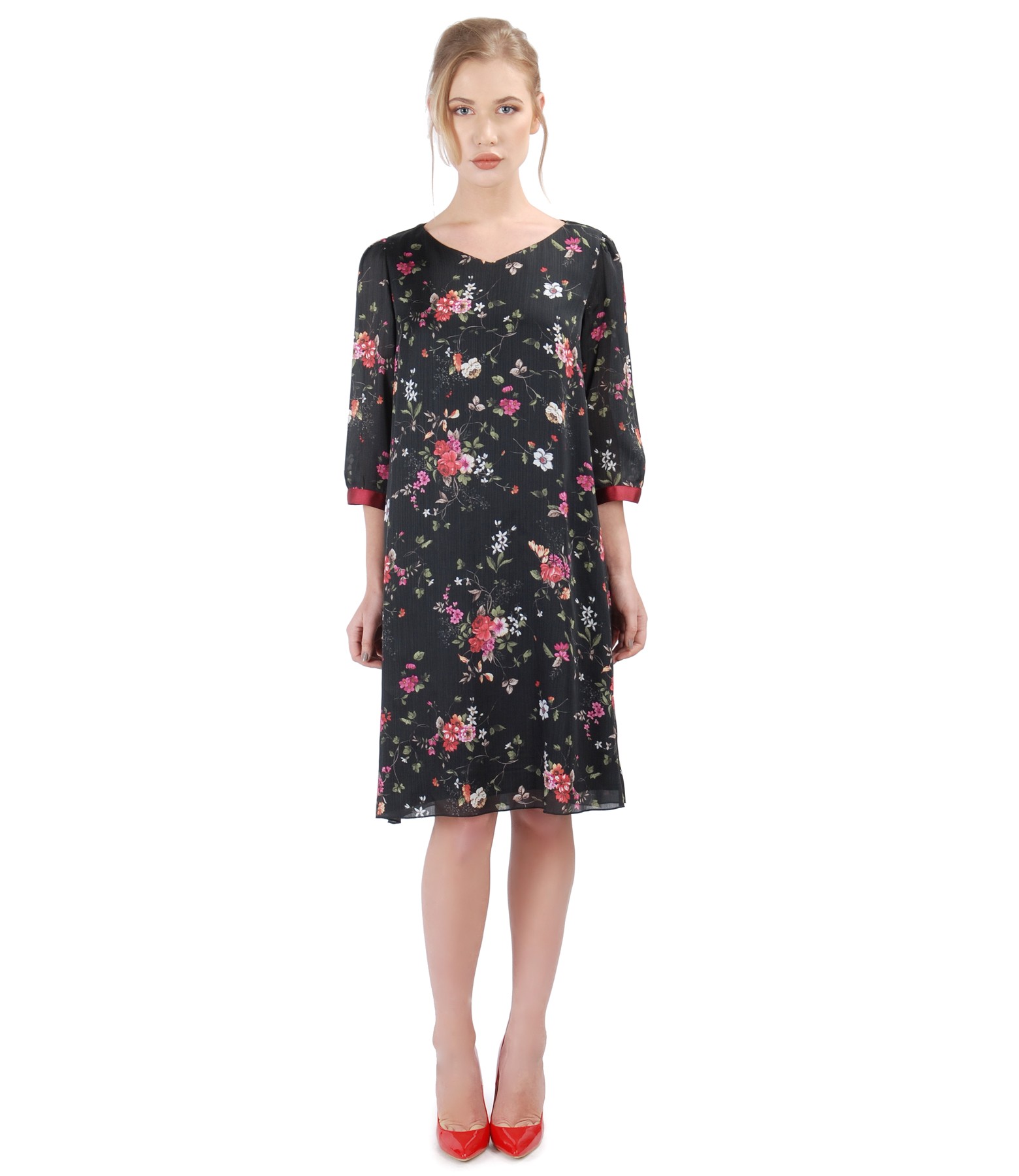 Rochie evazata din voal cu imprimeu floral, lejera, dublata cu viscoza, cu decolteu in V si garnitura la maneci. Nu are sistem de inchidere.