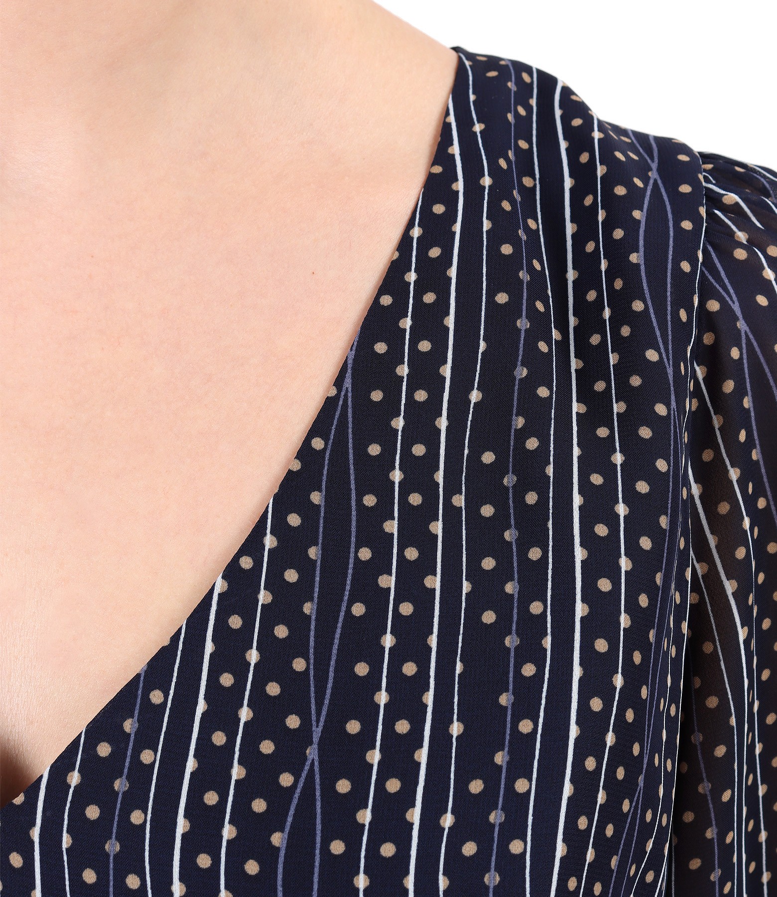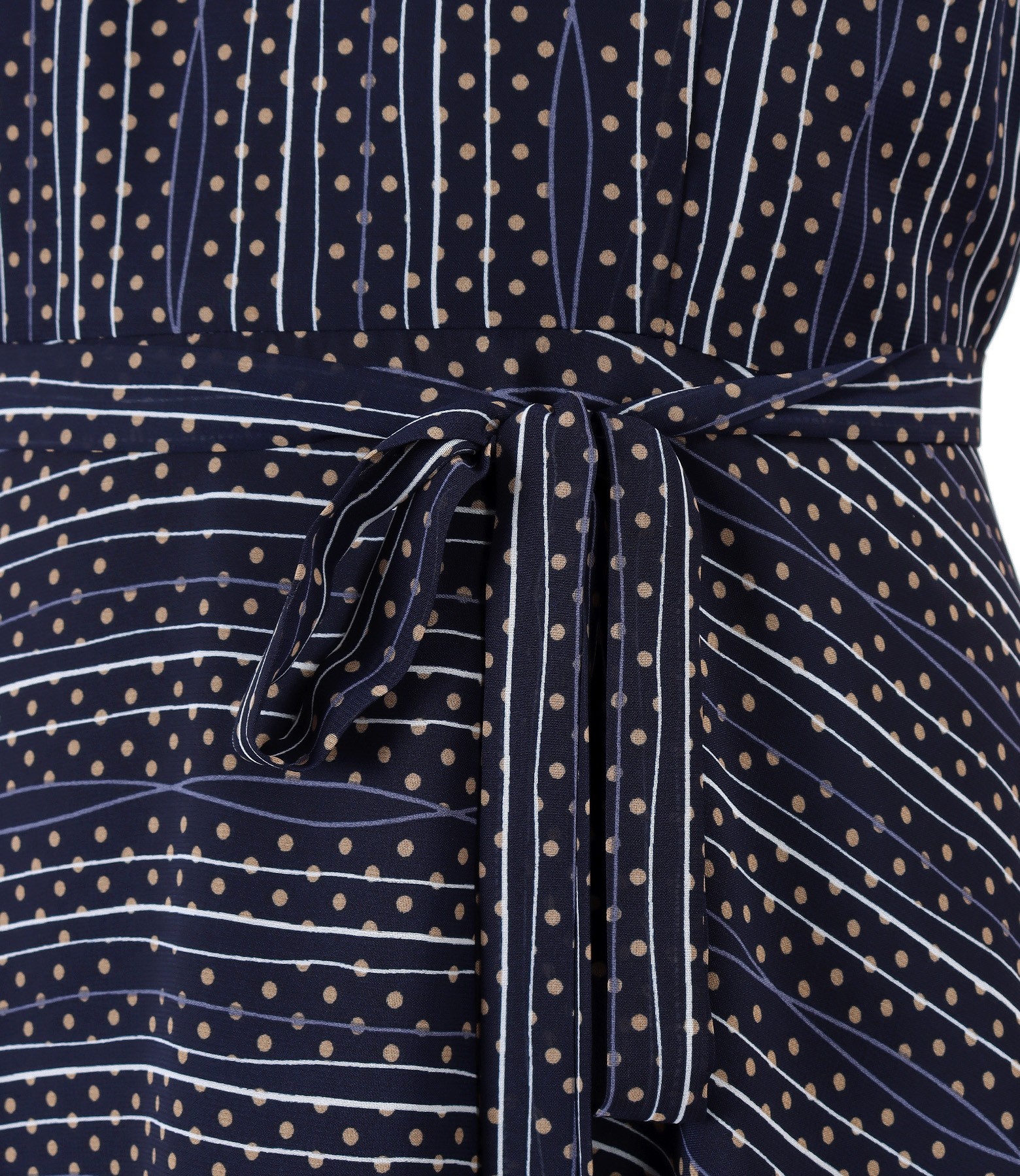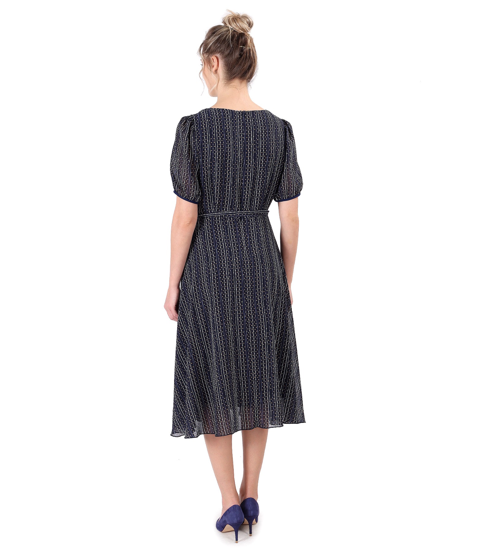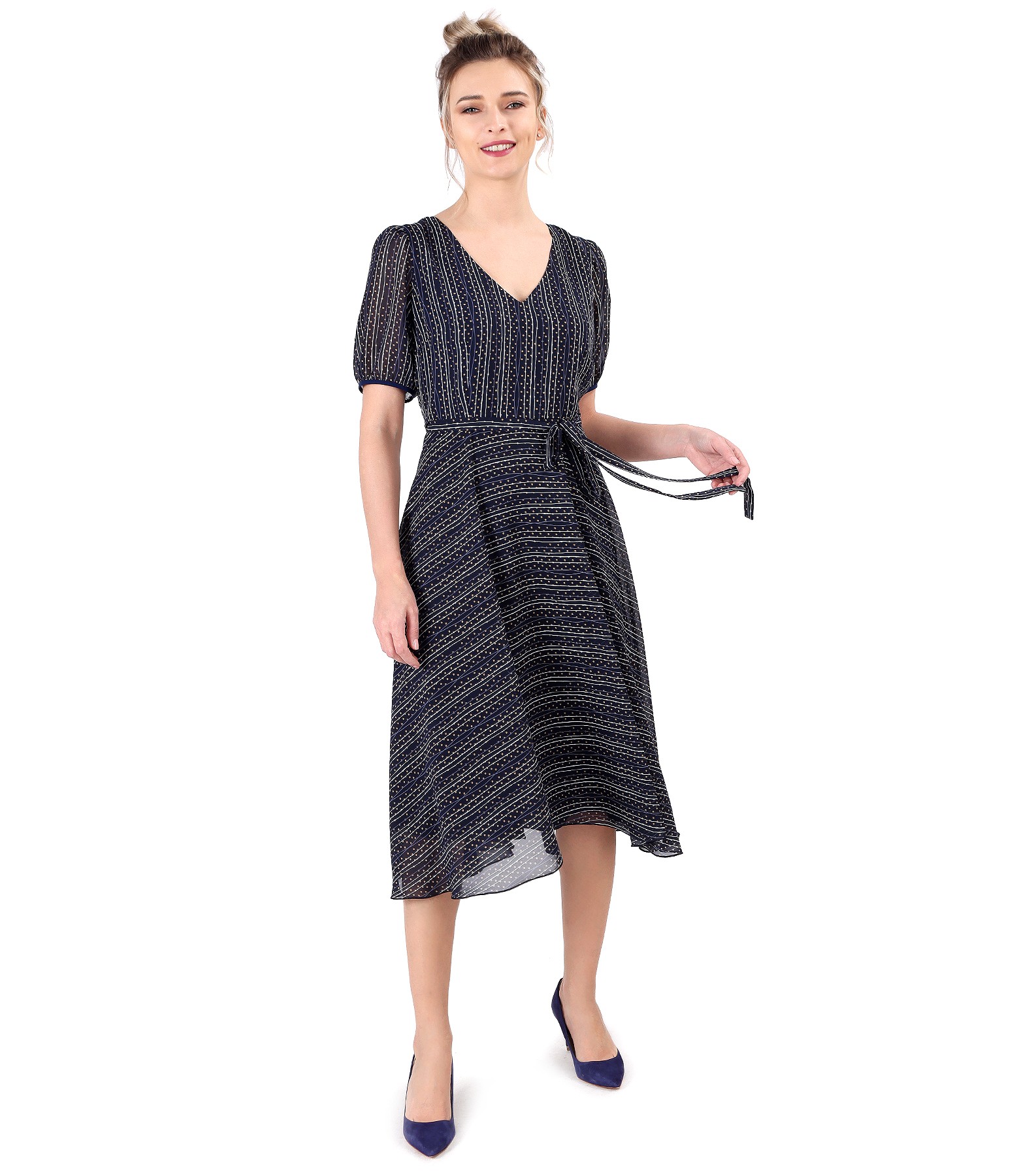 Rochie din voal imprimat cu dungi, dublata cu viscoza, cu maneci scurte cu elastic la terminatie, decolteu in V si cordon in talie. Se inchide cu fermoar ascuns pe mijloc spate.