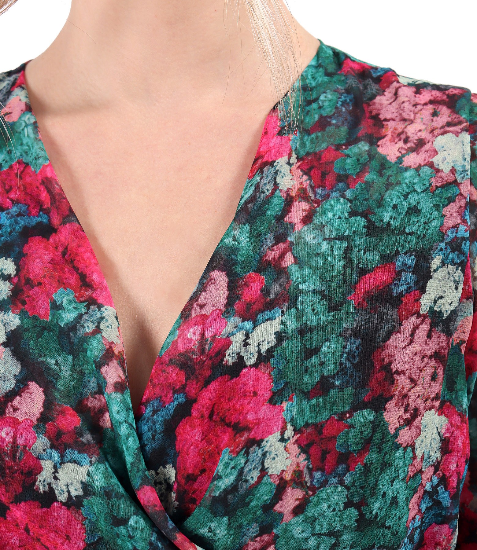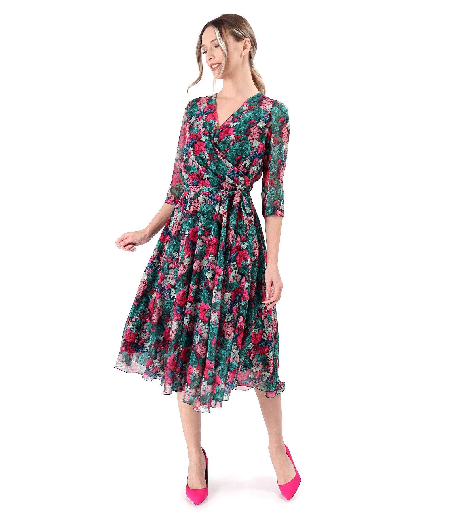 Rochie eleganta din voal imprimat cu motive florale, captusita cu viscoza, cu cordon in talie, cu maneci 3/4 si pieptii petrecuti. Se inchide cu fermoar ascuns pe mijloc spate.