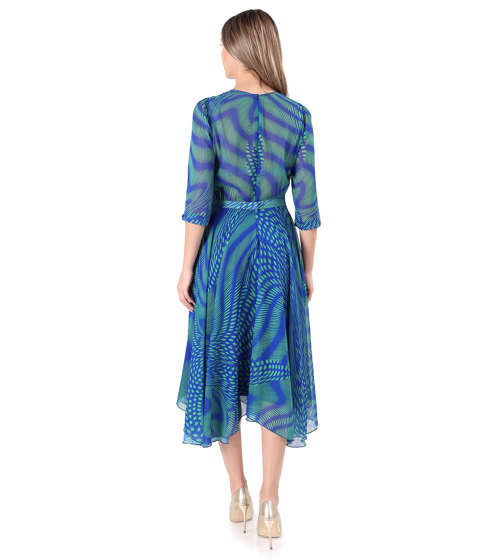 Rochie eleganta din voal imprimat cu motive geometrice, dublata cu viscoza, cu maneci 3/4 si pieptii petrecuti. Se inchide cu fermoar ascuns pe mijloc spate. Se strange cu un cordon cu funda din voal in talie.