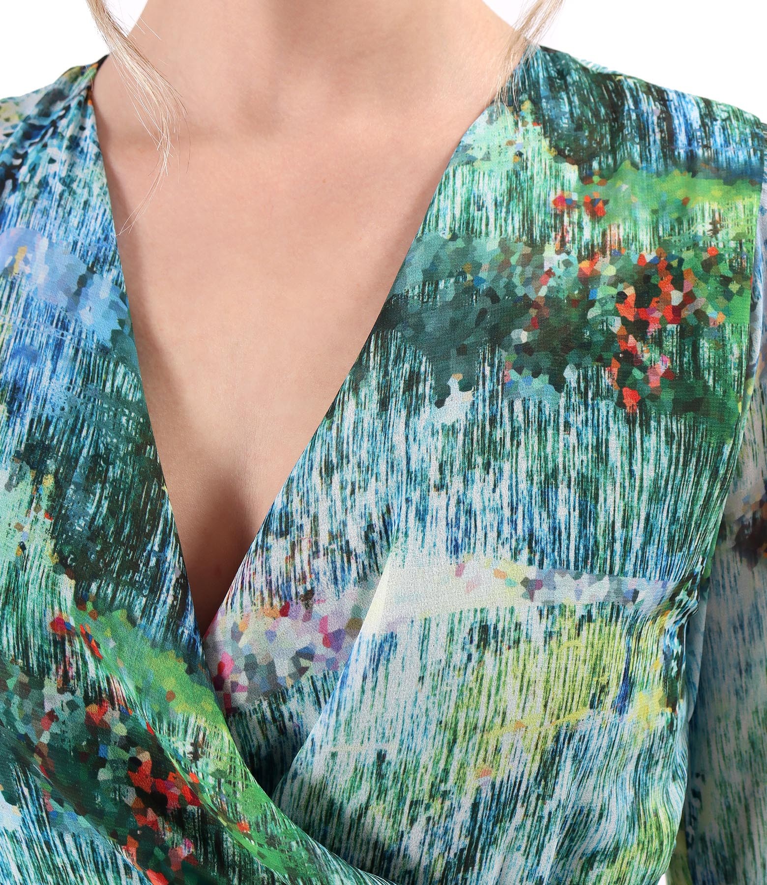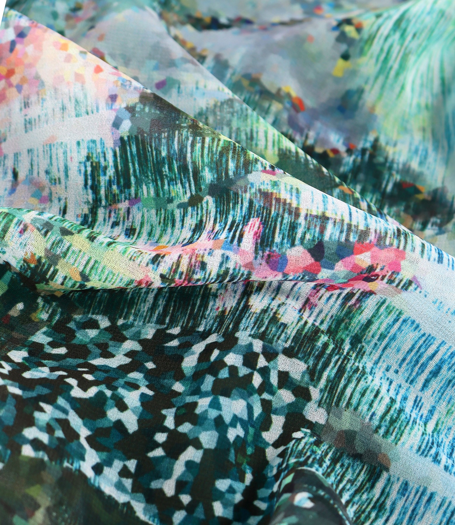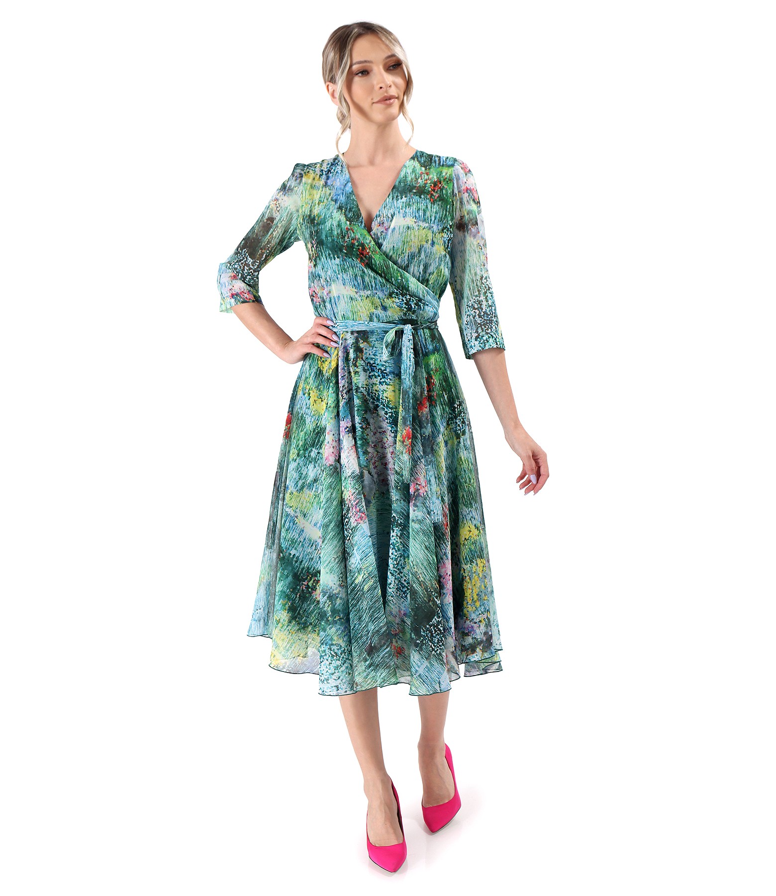 Rochie eleganta din voal imprimat, captusita cu viscoza, cu maneci 3/4, pieptii petrecuti si cordon in talie. Se inchide cu fermoar ascuns pe mijloc spate. Pentru o talie mai evidentiata se poate asorta cu esarfa-brau Celine. Esarfa se poate cumpara separat.