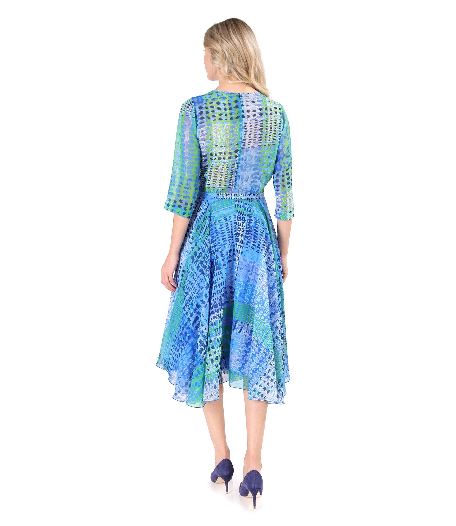 Rochie eleganta din voal imprimat, captusita cu viscoza, cu cordon in talie, cu maneci 3/4 si pieptii petrecuti. Se inchide cu fermoar ascuns pe mijloc spate.