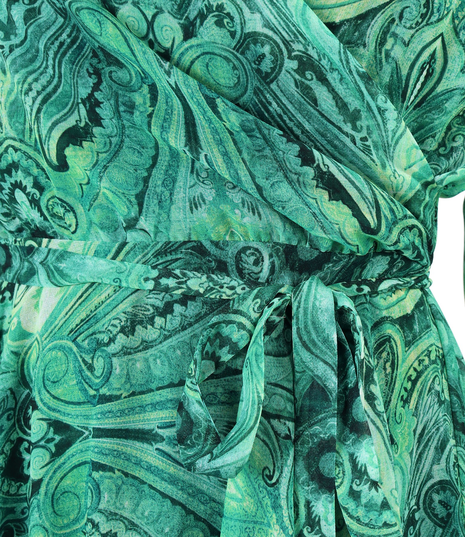 Rochie de seara din voal imprimat cu motive florale, captusita cu viscoza, cu maneci 3/4, pieptii petrecuti si cordon in talie. Se inchide cu fermoar ascuns pe mijloc spate.