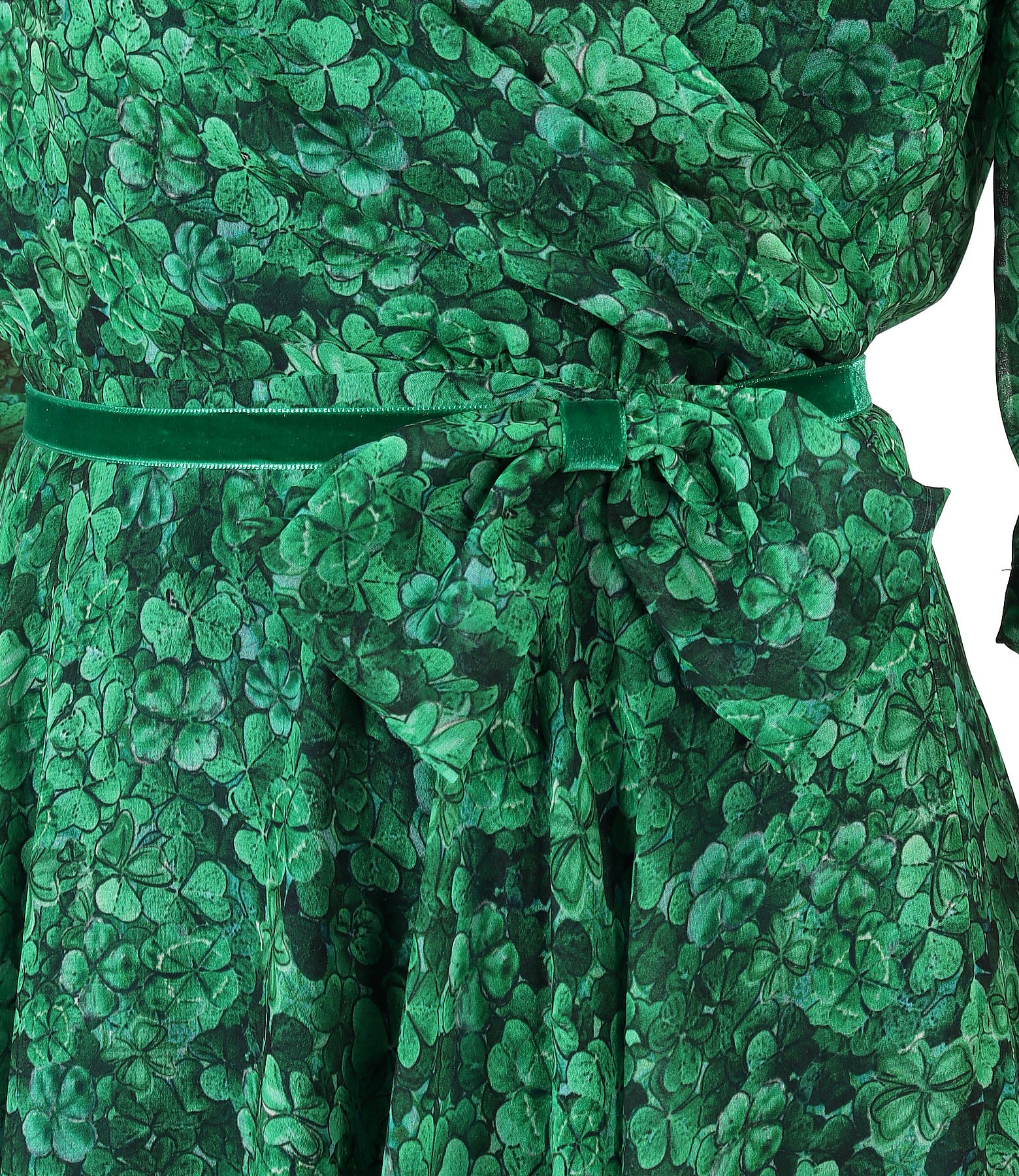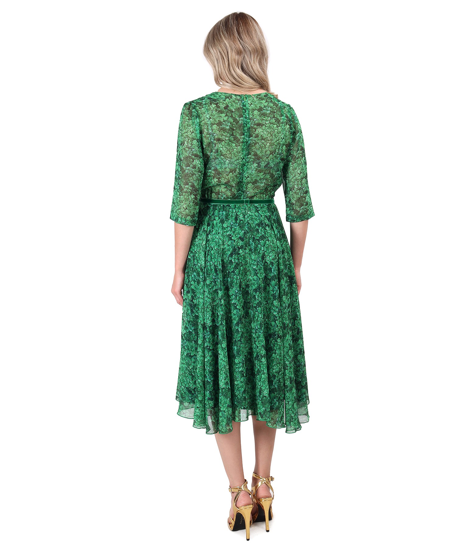 Rochie din voal imprimat cu motive florale, dublata cu viscoza, cu maneci 3/4 si pieptii petrecuti. Se inchide cu fermoar ascuns pe mijloc spate. Se strange cu un cordon din catifea cu funda din voal in talie. La marimile mari XL-3XL, spatele este dublat.