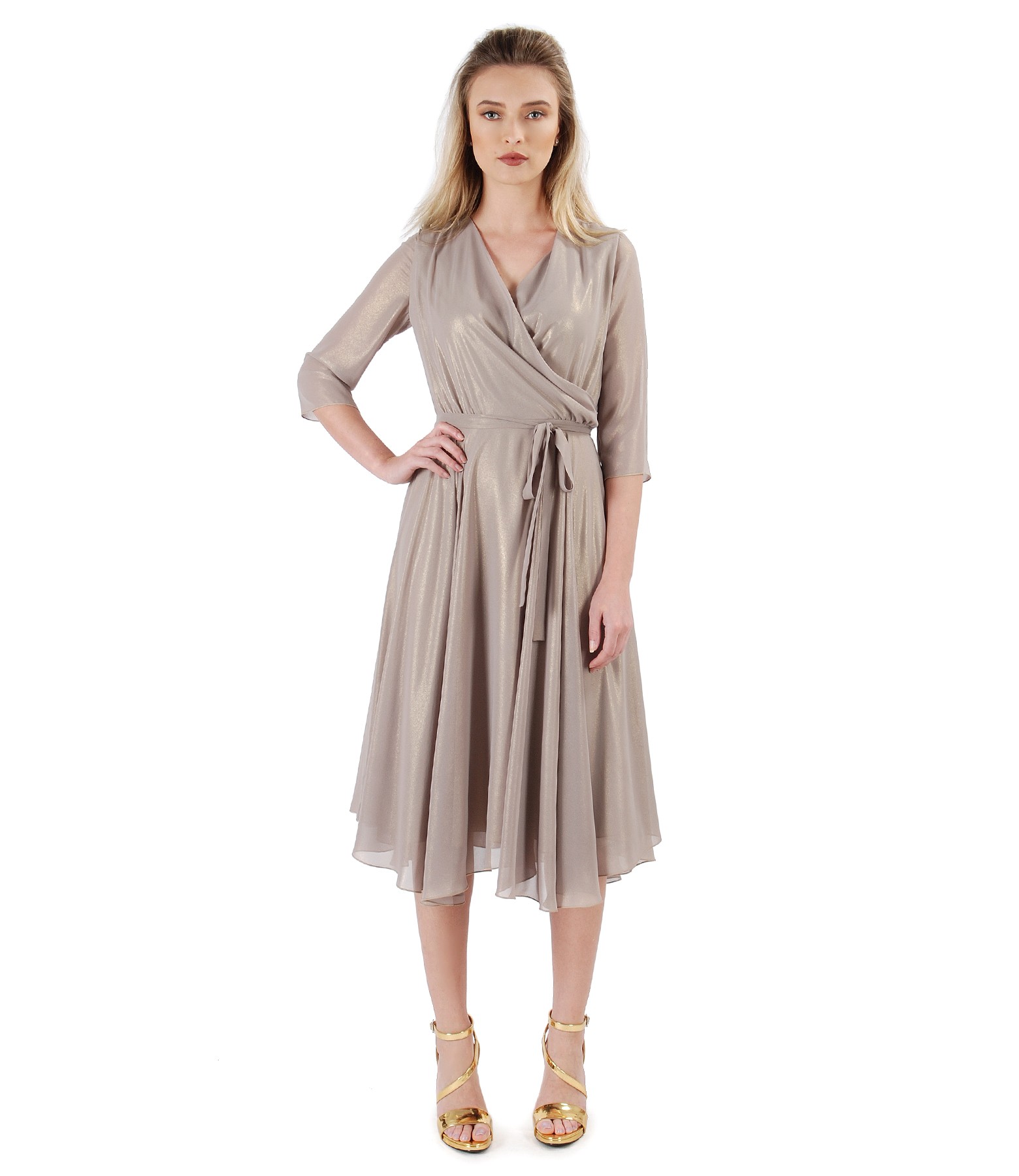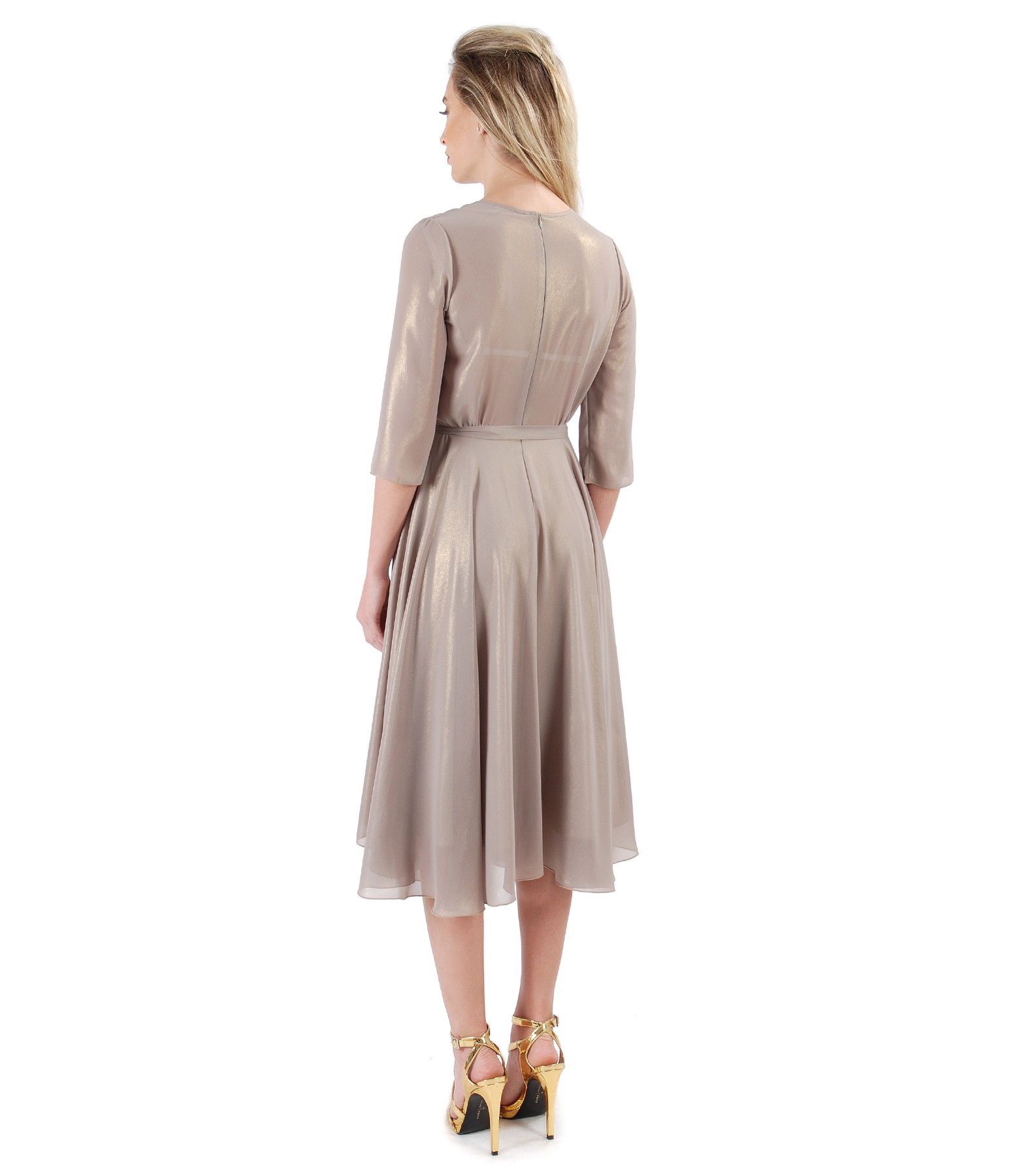 Rochie de seara din voal sidefat, captusita cu viscoza, cu maneci 3/4, pieptii petrecuti si cordon in talie. Se inchide cu fermoar ascuns pe mijloc spate.