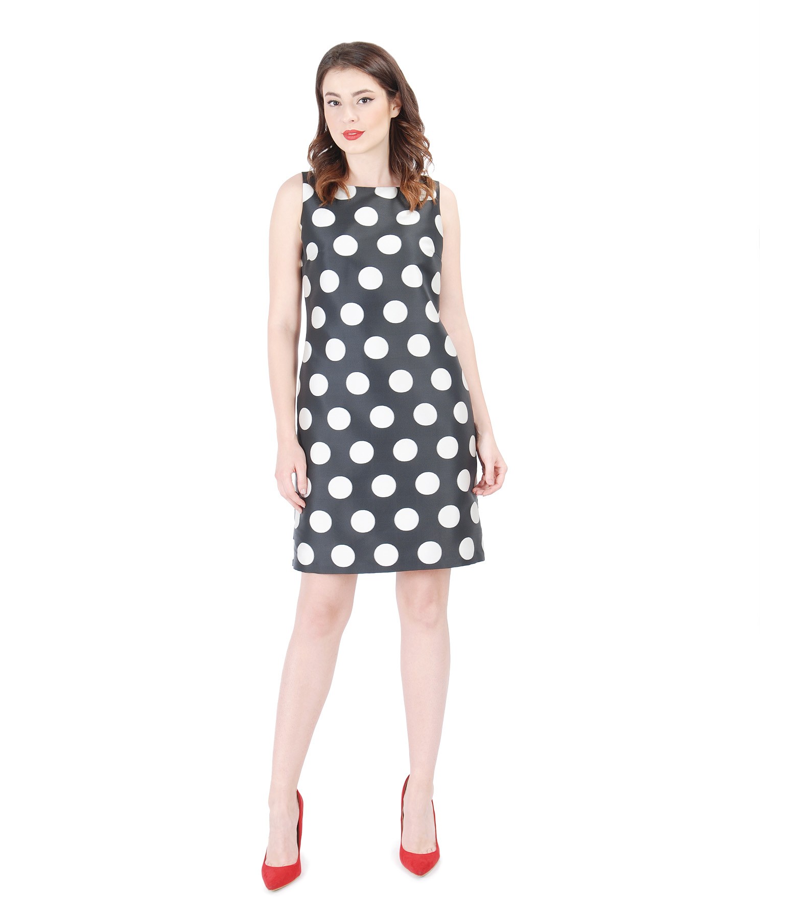 Rochie usor evazata, imprimata cu buline, cu model exclusiv, necaptusita, cu buzunare laterale si banda de rips constrat pe mijloc spate. Nu are sistem de inchidere.