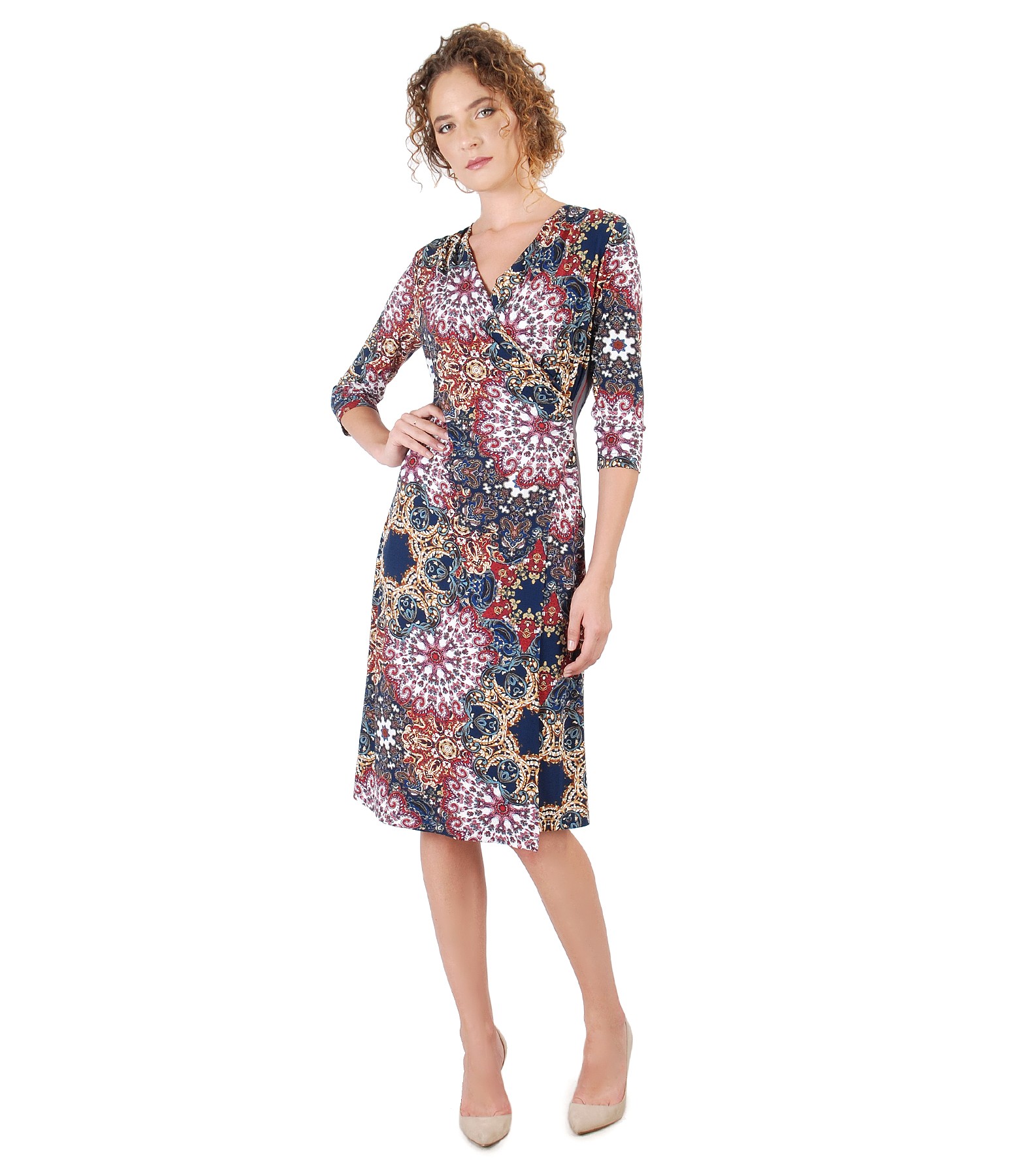 Rochie eleganta din jerse elastic imprimat in relief, cu maneci 3/4, pieptii petrecuti, cu umeri incretiti in partea din fata si banda de rips aplicata pe lateral stanga. Nu are sistem de inchidere.