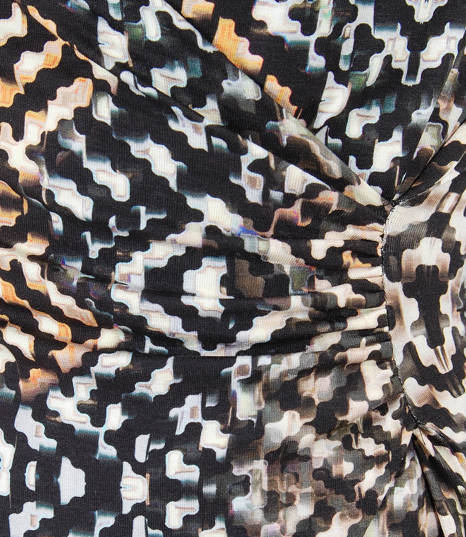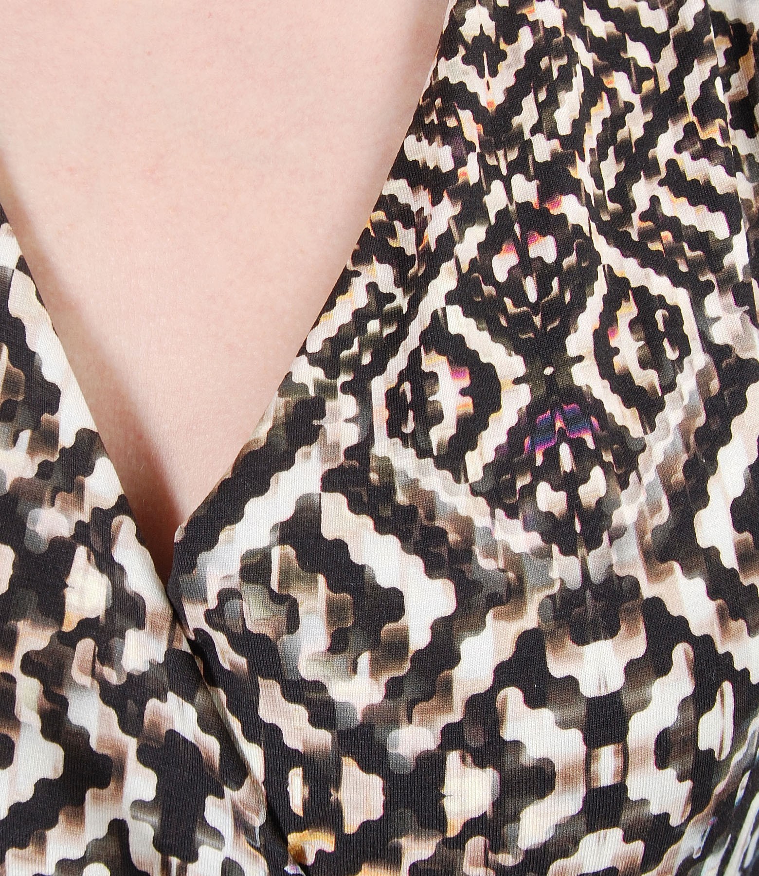 Rochie eleganta din jerse elastic imprimat, cu maneci scurte, pieptii petrecuti si cu umeri incretiti in partea din fata . Nu are sistem de inchidere.