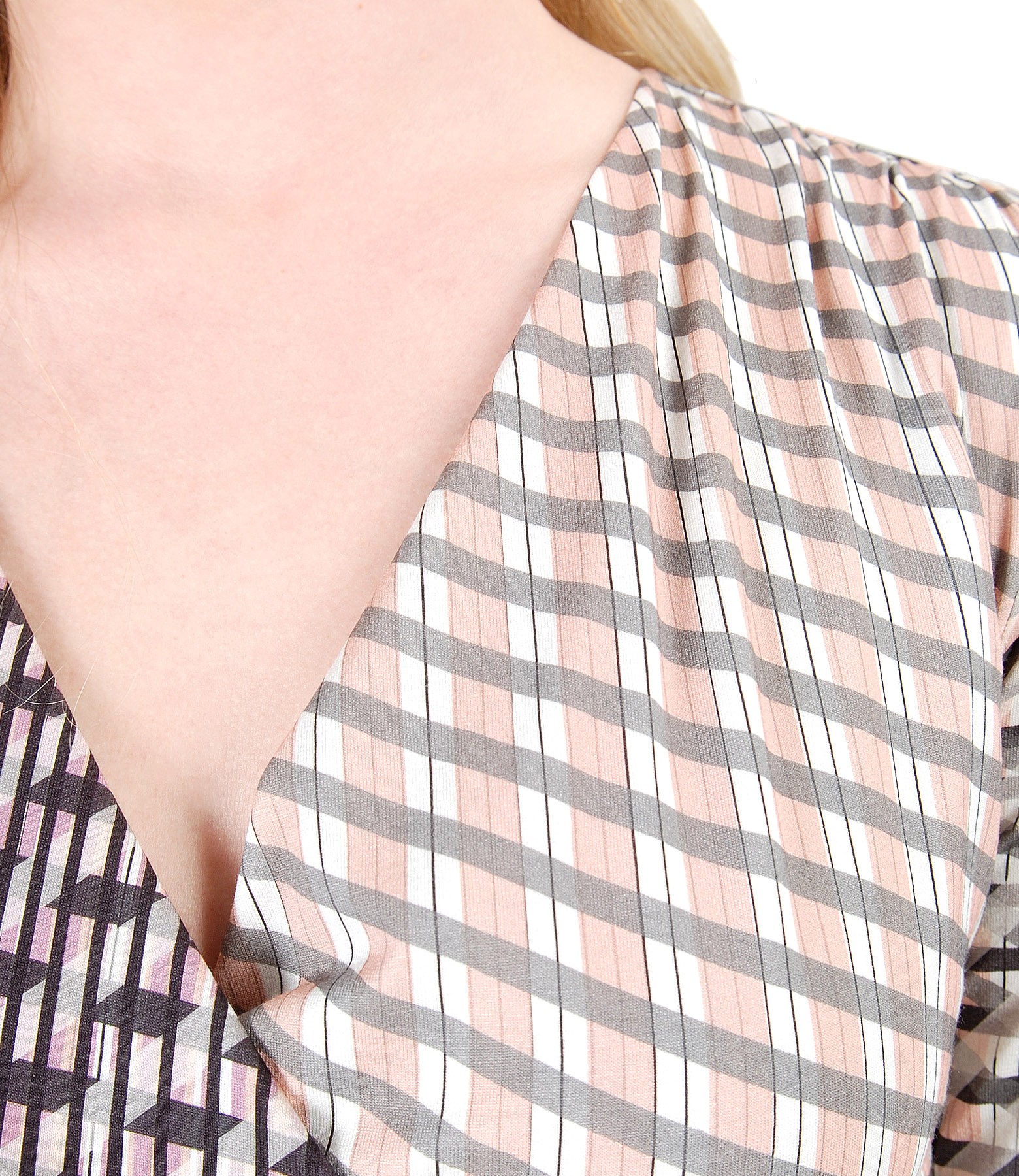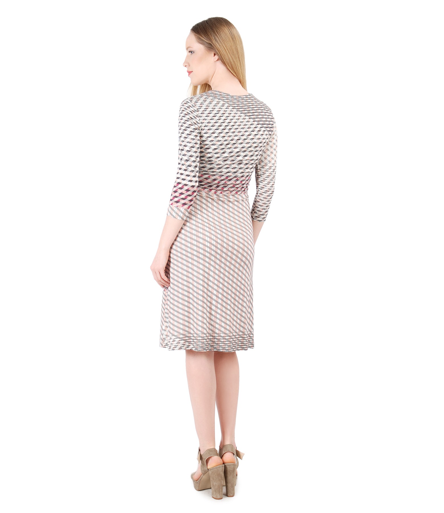 Rochie eleganta din jerse elastic imprimat, cu maneci 3/4, pieptii petrecuti si cu umeri incretiti in partea din fata . Nu are sistem de inchidere.
