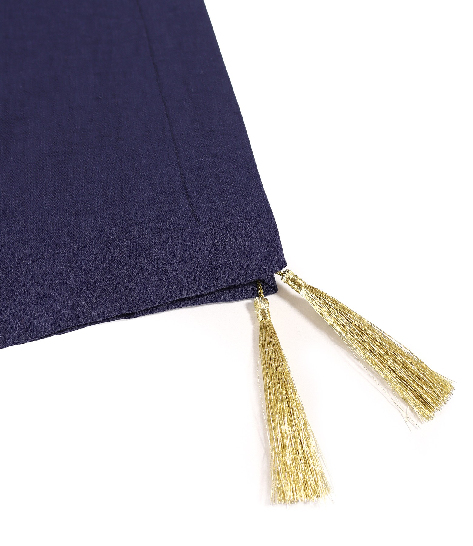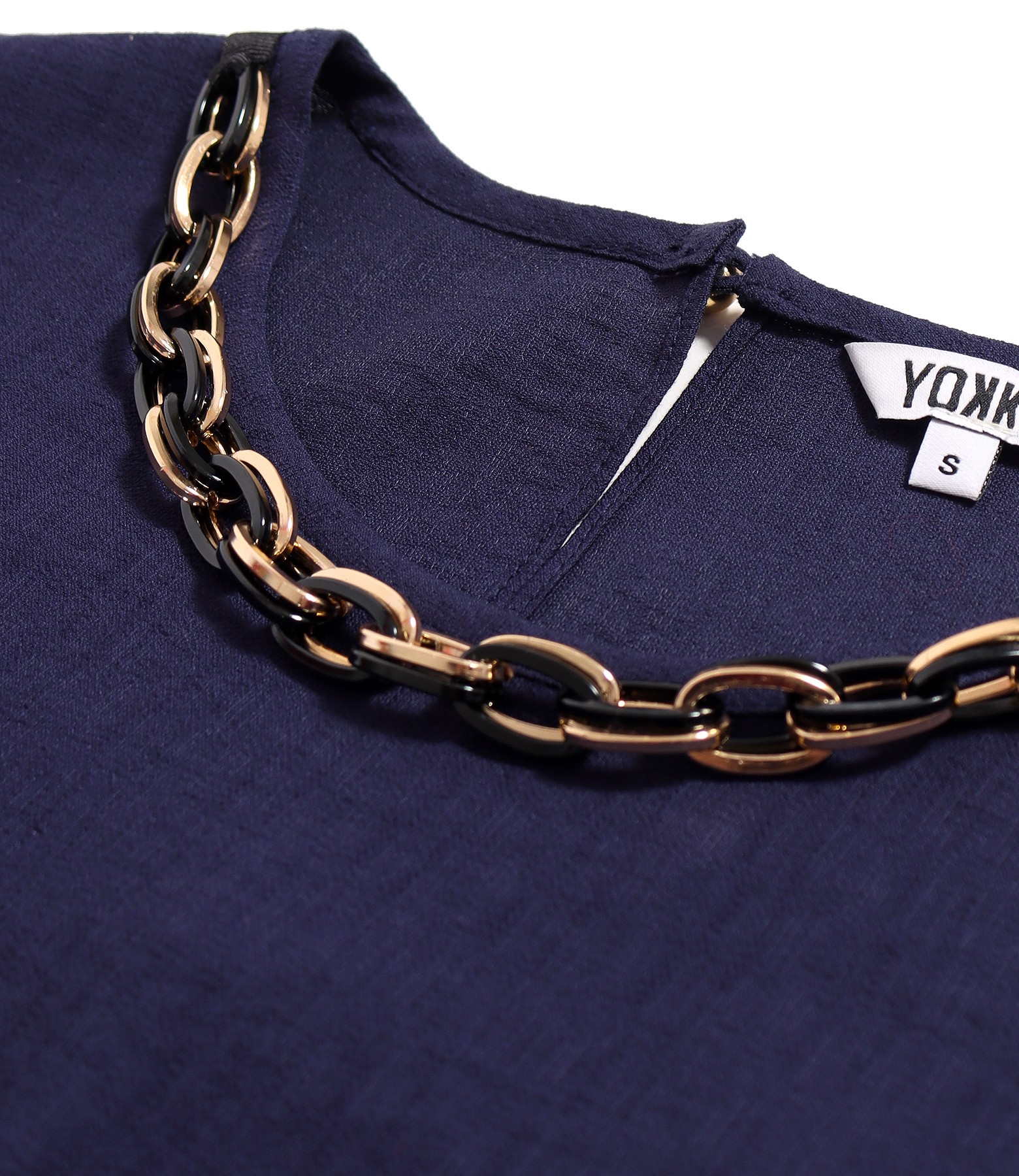 Rochie eleganta lunga din stofa cu viscoza, cu slit pe lateral stanga cu canafi aurii la terminatie si decolteu rotund cu lant decorativ. Se inchide cu un nasture pe mijloc spate.