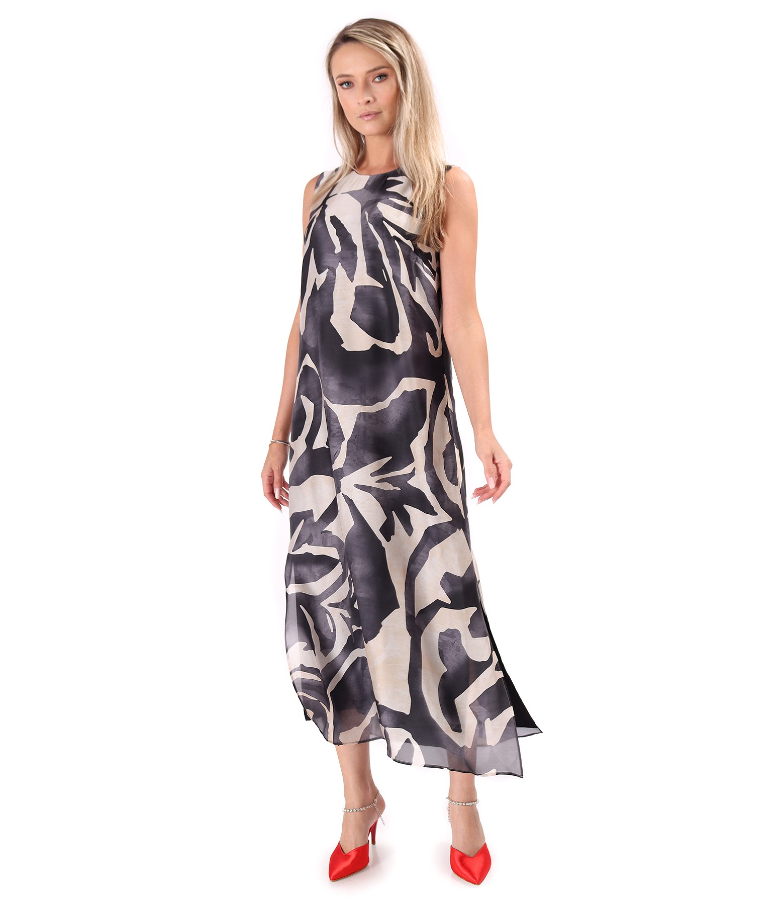 Rochie eleganta lunga imprimata digital cu motive geometrice, dublata cu viscoza, cu slituri pe laterale si decolteu rotund. Se inchide cu fermoar ascuns pe mijloc spate. Pozitia imprimeului variaza per produs.