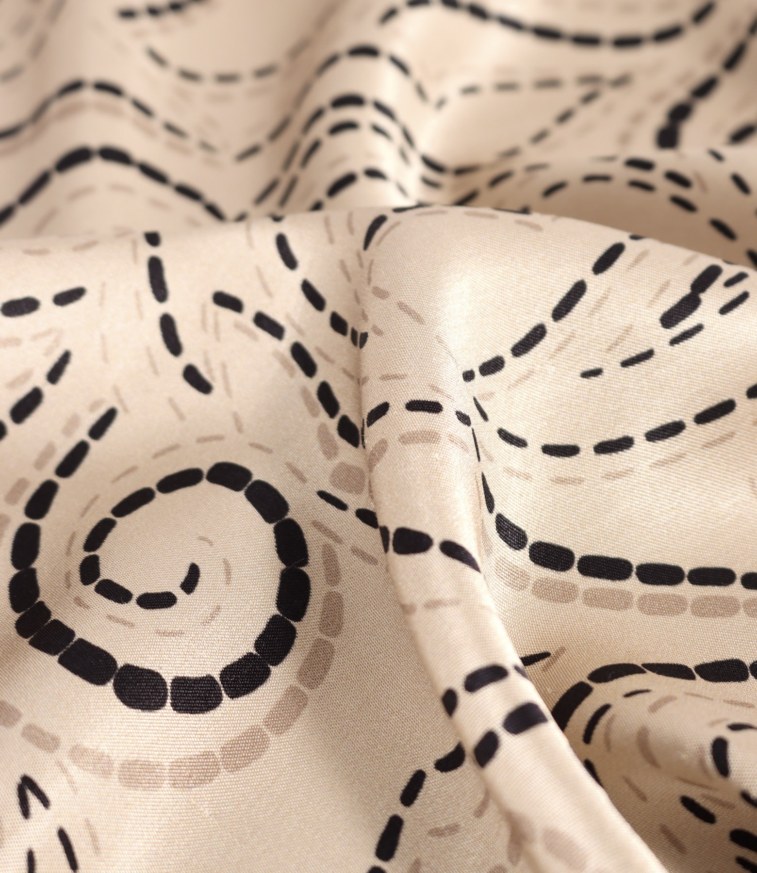 Rochie eleganta midi din viscoza satinata imprimata, dublata cu viscoza in partea de sus, cu slit pe fata, decolteu adanc in V si maneci lungi incretite la terminatie. Se inchide cu fermoar ascuns pe mijloc spate.