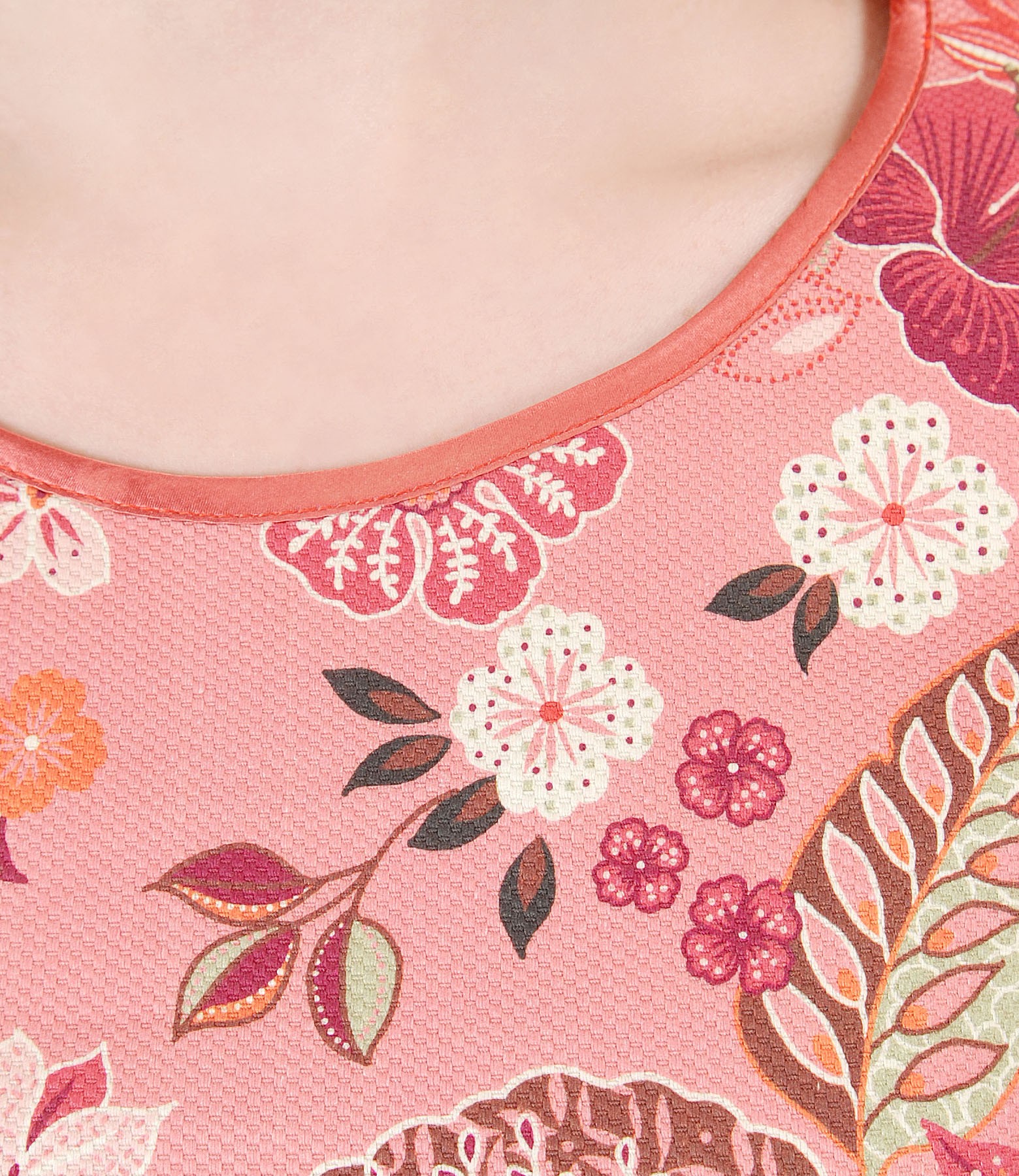 Rochie din bumbac elastic texturat, necaptusita, cu imprimeu floral, cu maneci scurte, decolteu rotund si buzunare laterale. Nu are sistem de inchidere.