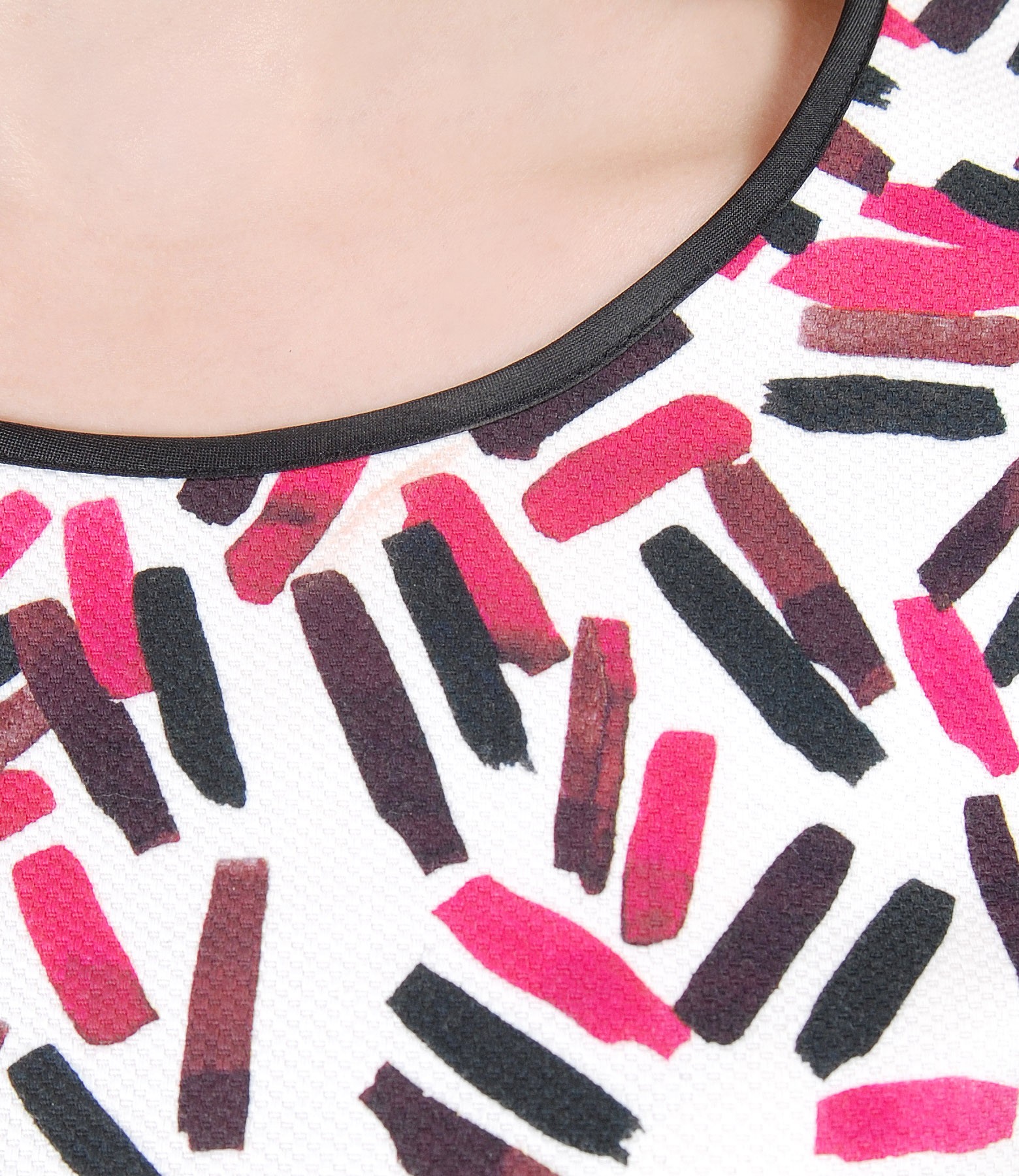 Rochie din bumbac elastic texturat, necaptusita, cu imprimeu floral, cu maneci scurte, decolteu rotund si buzunare laterale. Nu are sistem de inchidere.