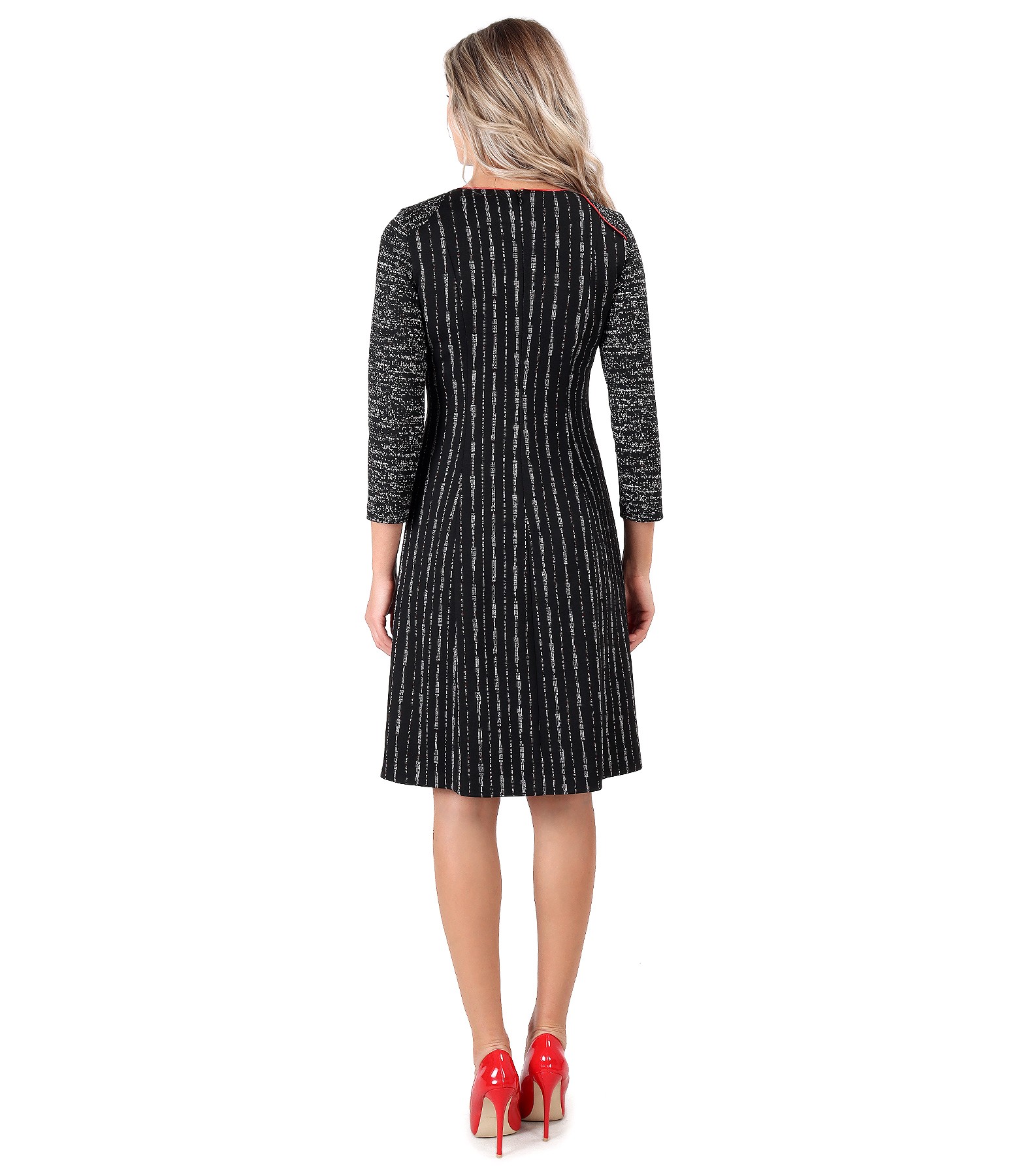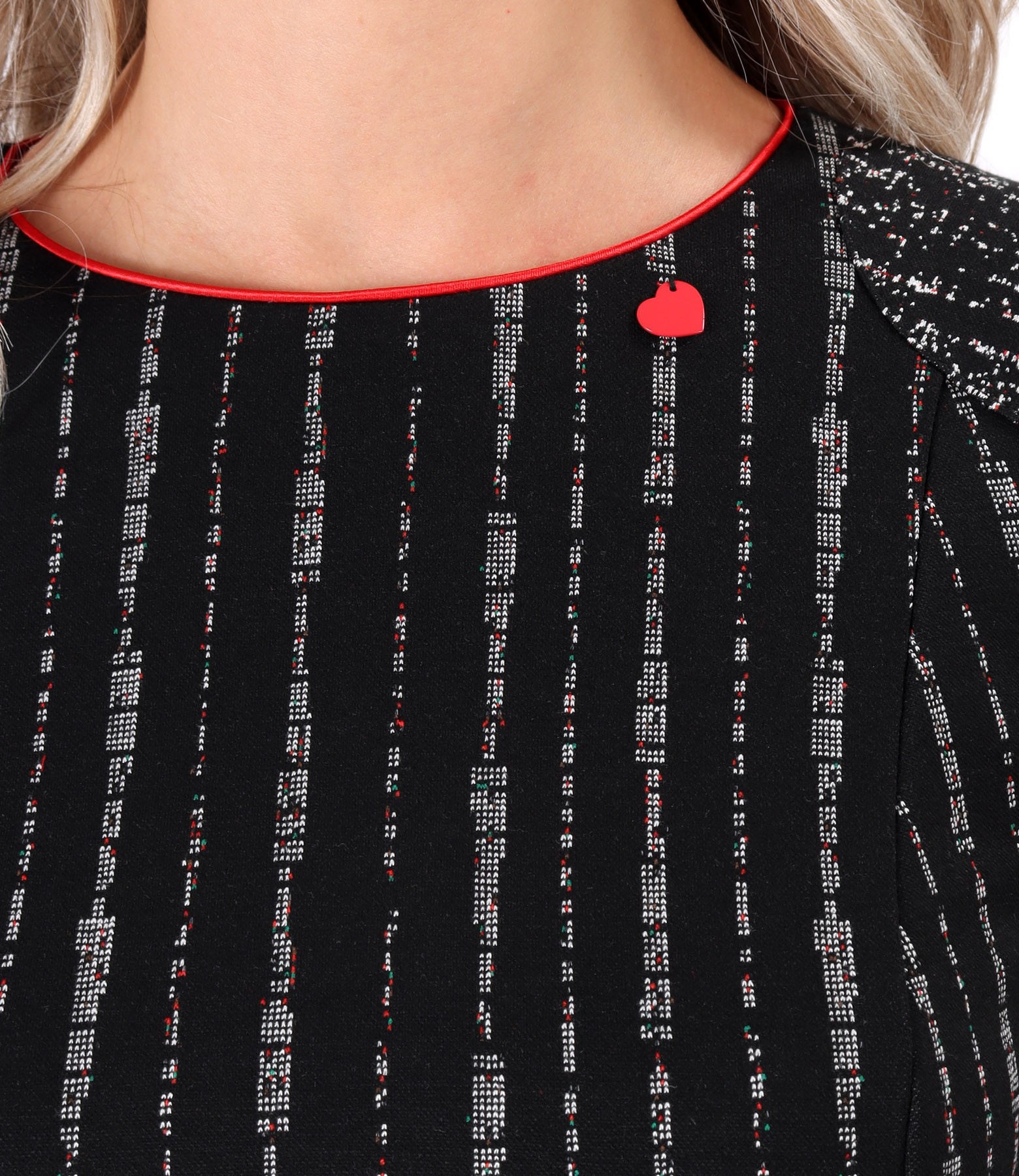 Rochie evazata din jerse elastic gros imprimat, cu maneci 3/4, decolteu rotund si inima metalica decorativa, cusuta la decolteu. Se inchide cu fermoar ascuns pe mijloc spate.