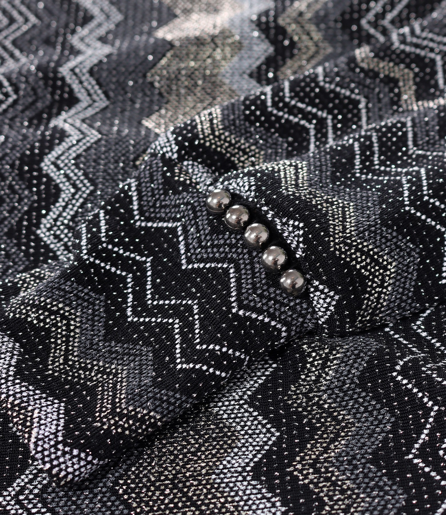 Rochie evazata din stofa elastica cu fir metalic, captusita, cu decolteu adanc in V si cu maneci lungi cu mansete din acelasi material cu margele. Se inchide cu fermoar ascuns pe mijloc spate.