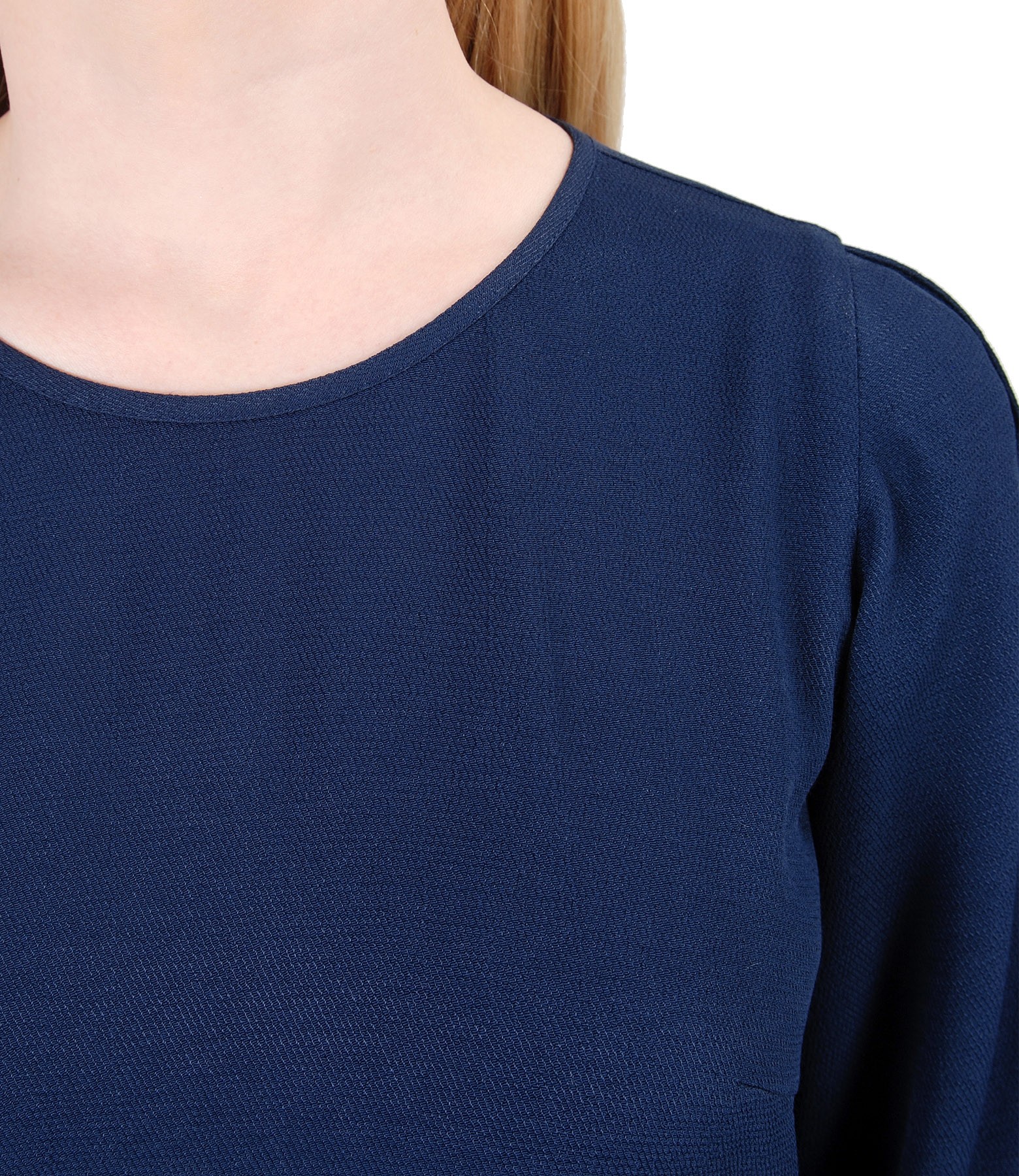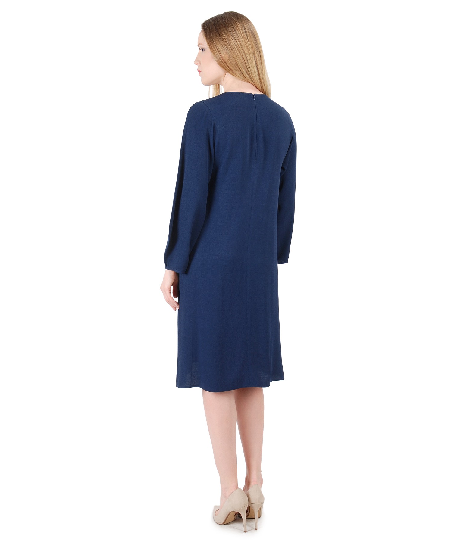 Rochie evazata din viscoza, necaptusita, cu maneci lungi, pliuri laterale si decolteu rotund. Se inchide cu fermoar ascuns pe mijloc spate.