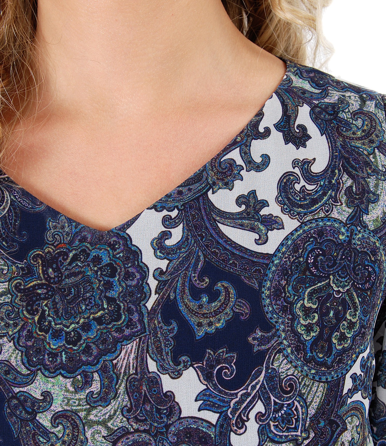Rochie evazata din voal cu imprimeu floral, lejera, dublata cu viscoza, cu decolteu in V si garnitura la maneci.