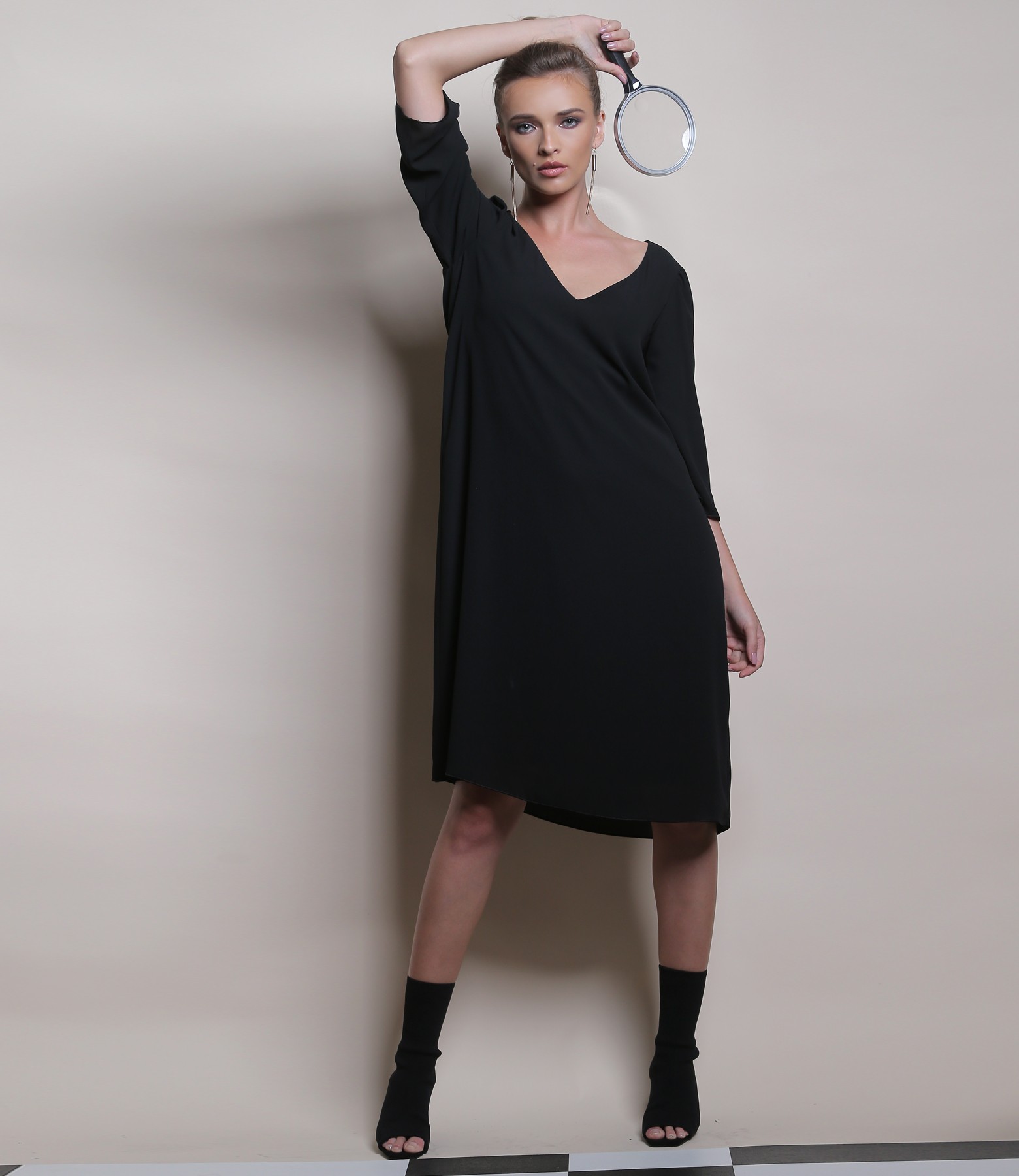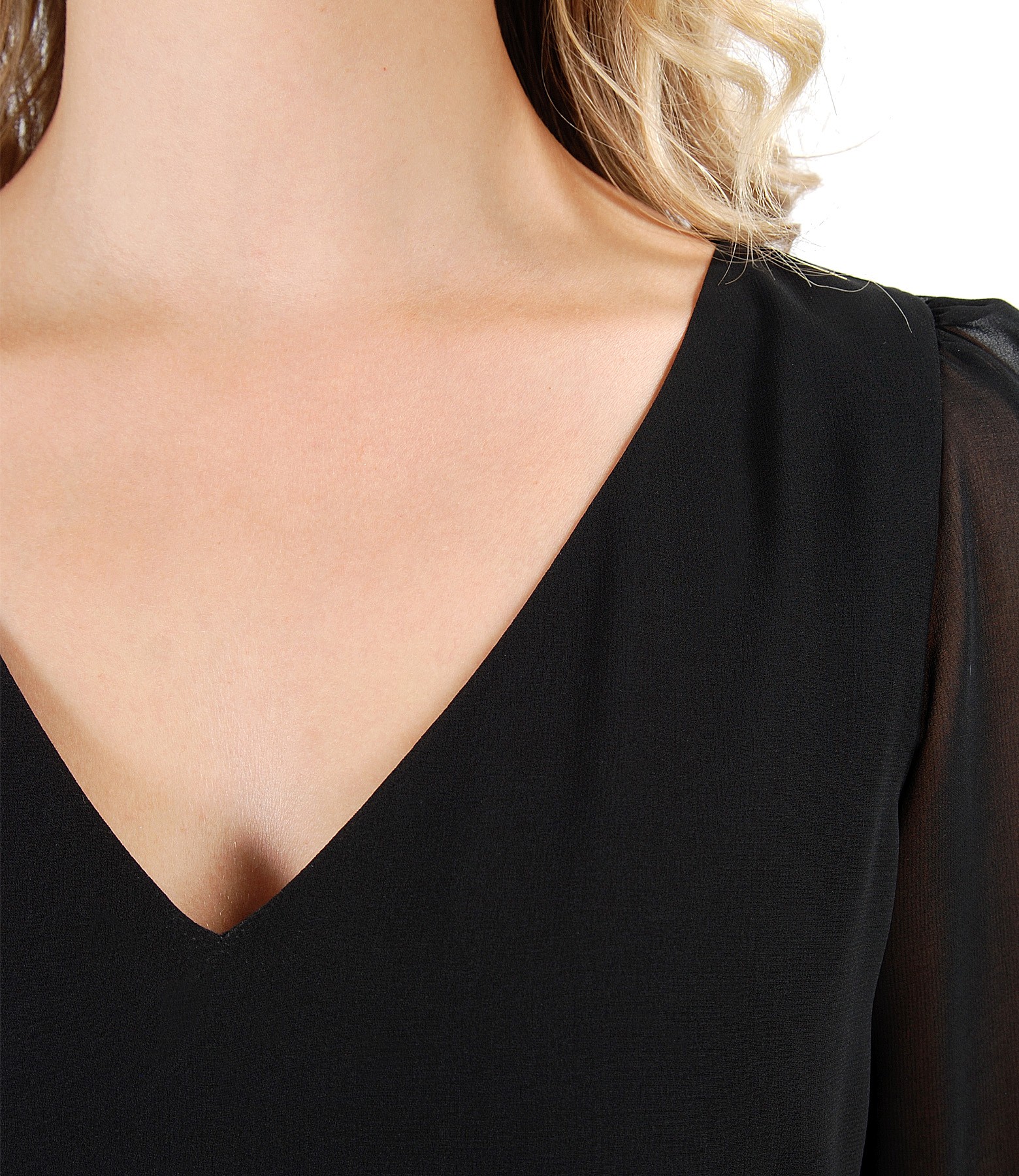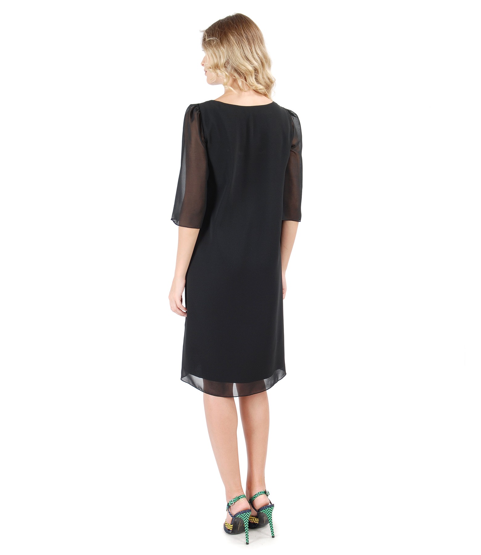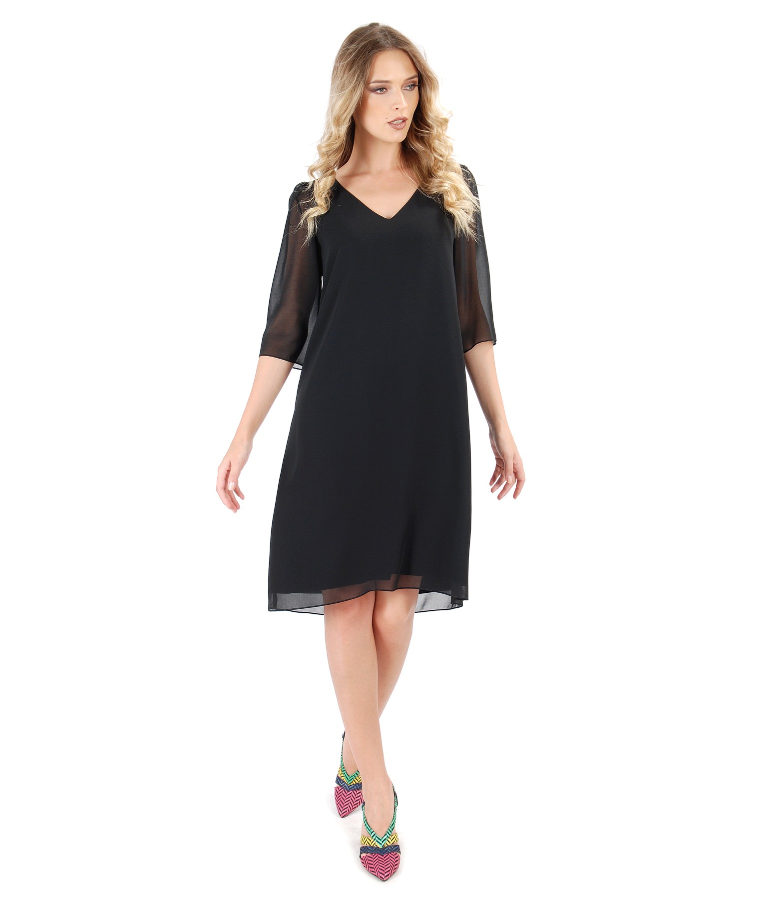 Rochie evazata din voal uni, dublata cu viscoza, cu maneci 3/4 si decolteu in V.