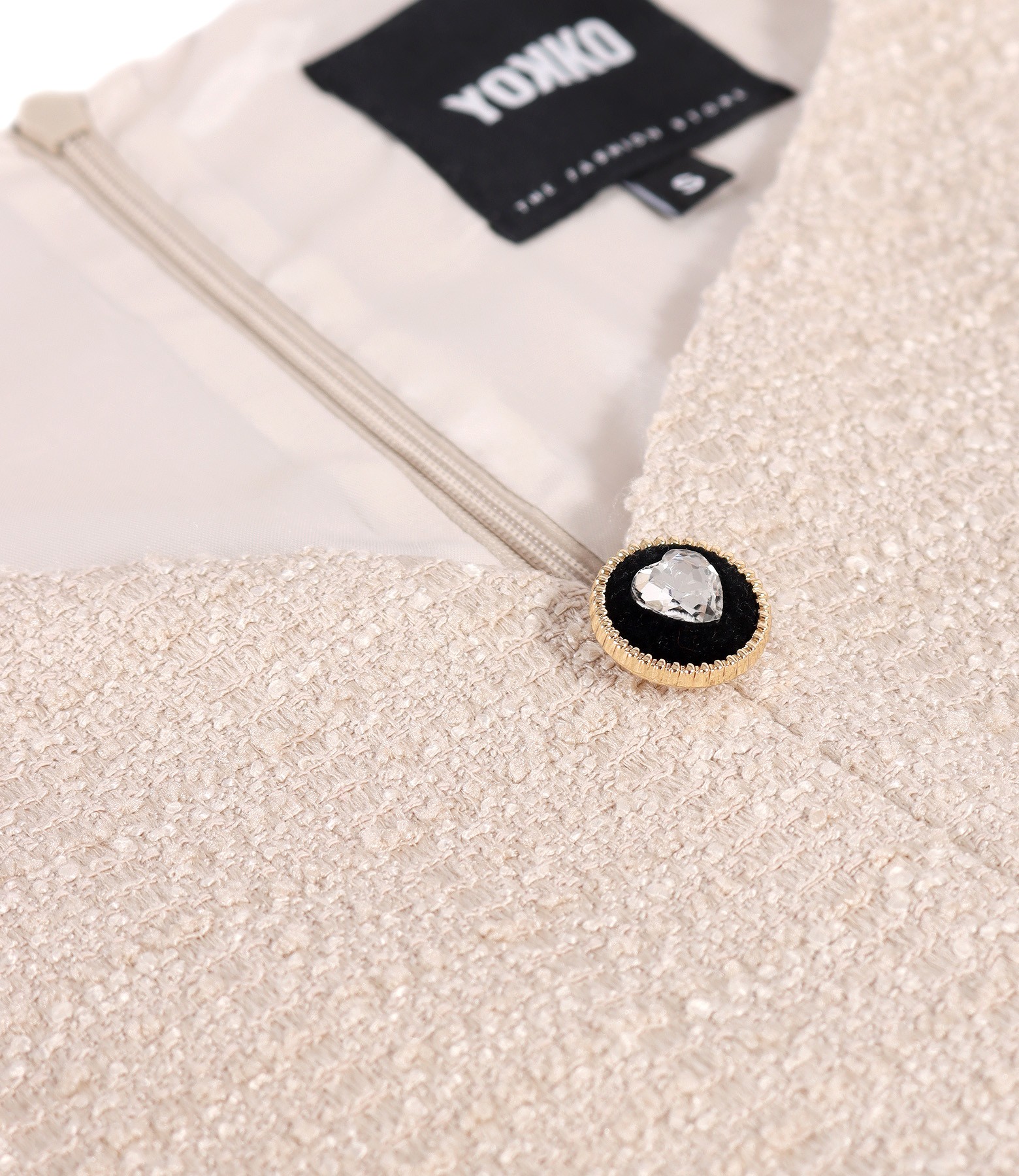 Rochie evazata tip sarafan din bucle cu viscoza si bumbac, captusita, fara maneci si cu nasture decorativ la decolteu. Se inchide cu fermoar ascuns pe mijloc spate.