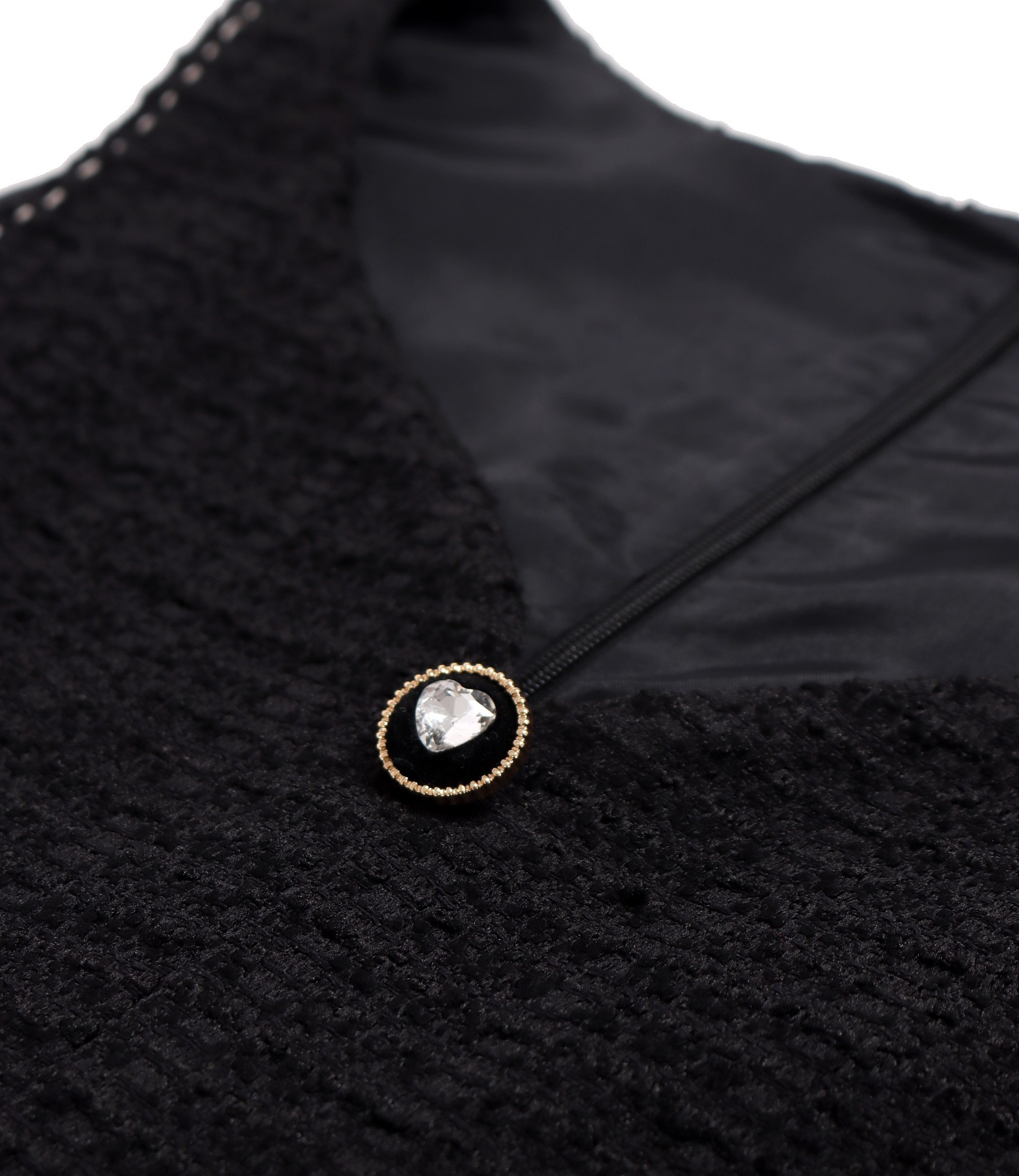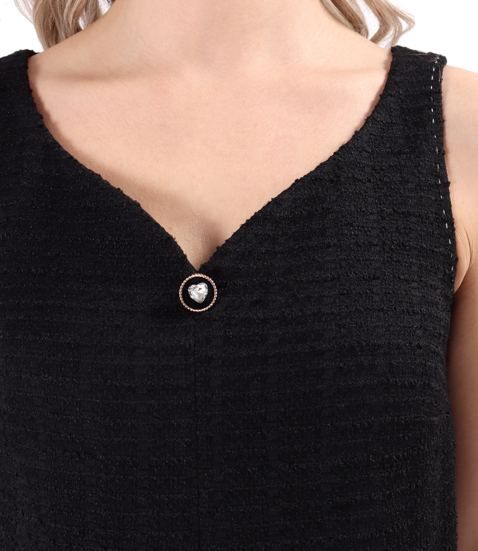 Rochie evazata tip sarafan din bucle cu viscoza si bumbac, captusita, fara maneci si cu nasture decorativ la decolteu. Se inchide cu fermoar ascuns pe mijloc spate.